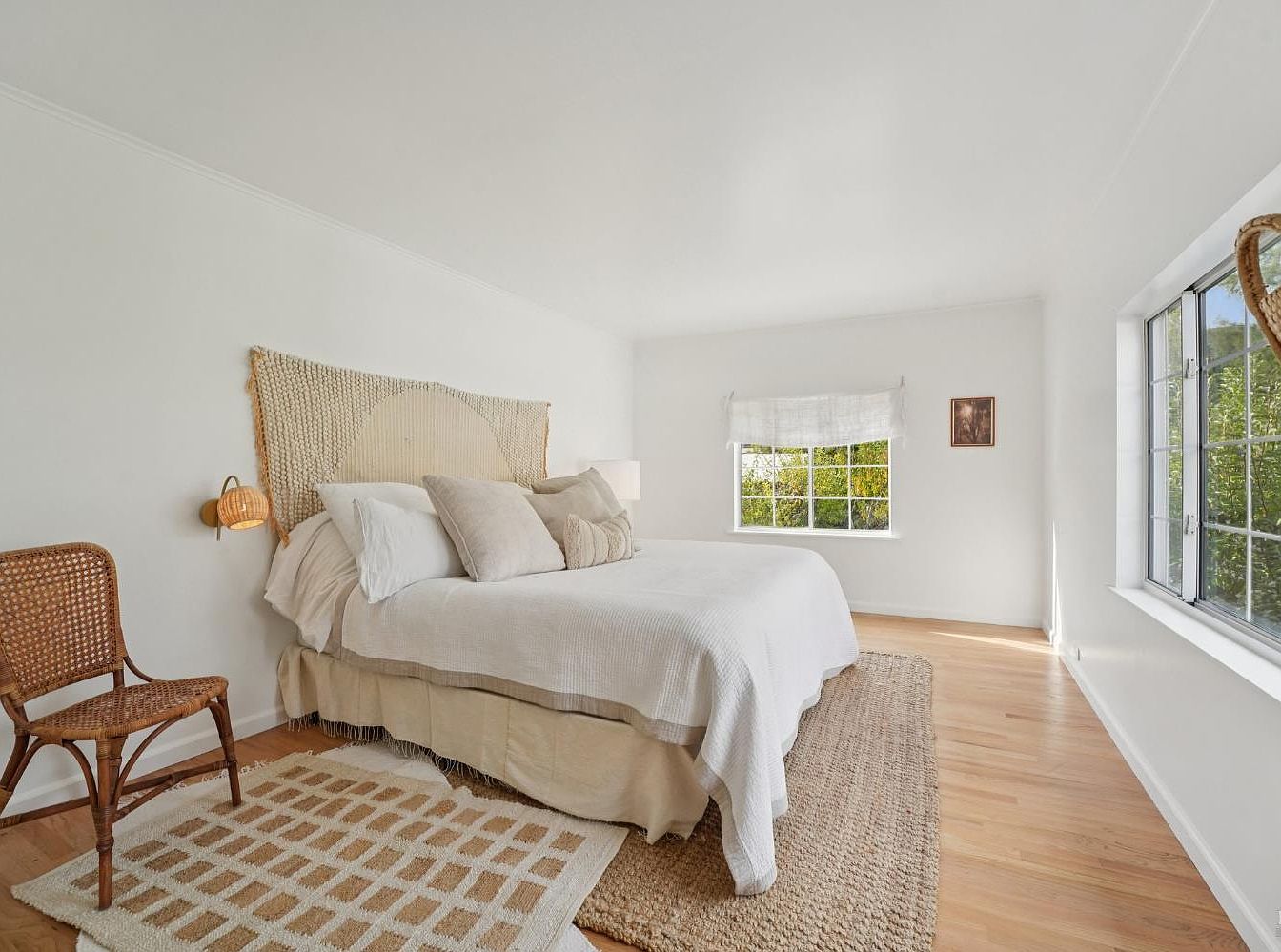 A serene, minimalist bedroom features a cozy bed with a textured, woven headboard and layers of neutral-toned bedding topped with plump pillows in beige and white. The room is awash in natural light from two expansive windows—one to the side and one at the end of the room—each framed in crisp white and offering greenery views outside. Pale wooden floors support two overlapping, earth-toned rugs, bringing warmth to the space. A single rattan chair sits beside the bed, and a woven wall sconce and small artwork add understated accents. The overall aesthetic is airy, tranquil, and natural.
