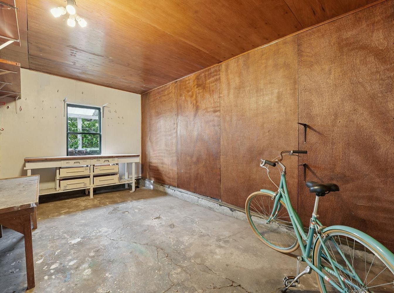 A utilitarian garage space features unfinished concrete floors showing natural wear and subtle stains, adding a rustic element. The ceiling and one wall are clad in warm-toned wood panels, creating a cohesive, vintage feel. A single window on the far wall brings in daylight and overlooks greenery outside. Below the window, a sturdy built-in wooden workbench with drawers, painted in a cream color, emphasizes functionality. To the left, a partial view of another table suggests additional workspace. The right side holds a seafoam green bicycle, leaning against the wood-paneled wall. Exposed hooks and empty shelves on the far wall hint at a space meant for tools and projects.