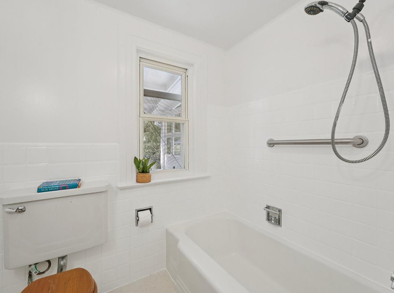 A compact bathroom corner featuring a classic white bathtub with a chrome handheld showerhead and a horizontal grab bar above, all set against shiny white tile walls that continue up midway, creating a crisp, clean atmosphere. Bright natural light streams in through a double-hung window above the tub, its white trim accentuating the minimalist style. A single potted plant adds a touch of greenery on the window ledge. The toilet, topped with a wooden seat and a book, is positioned conveniently beside the tub. The overall look is simple and functional, projecting a vintage yet fresh vibe.