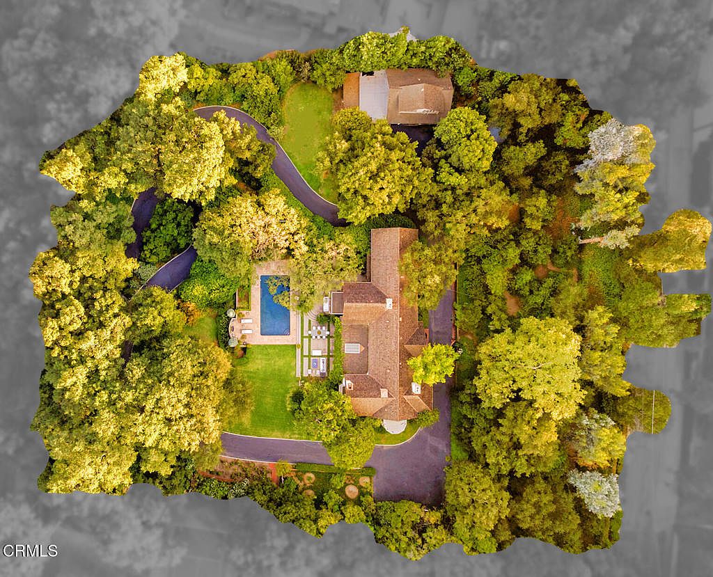 An expansive aerial perspective showcases a sprawling historic home nestled amid lush greenery. The elegant structure features a blend of warm-toned roofing and a harmonious color palette. A rectangular pool sparkles in the center, framed by intricate stonework terraces, ideal for outdoor gatherings. Surrounding the property, meandering pathways guide through abundant trees, enhancing the natural landscape. A circular driveway leads to the home, emphasizing convenience and elegance. Varied plantings, including hedges and flowering shrubs, add charm to the picturesque setting, embodying tranquility and a sense of secluded luxury.