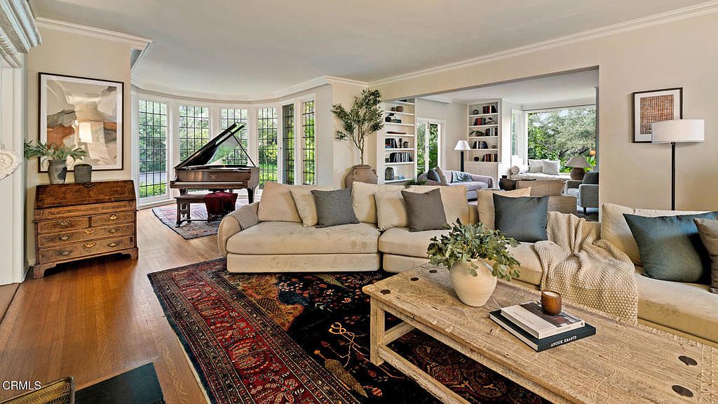 This spacious living room features a soft, neutral color palette with cream and beige tones. The centerpiece is a plush sectional sofa adorned with gray and blue accent pillows, inviting relaxation. A rustic wooden coffee table rests on a rich, patterned area rug, enhancing the cozy atmosphere. Natural light floods the room through expansive windows, showcasing a view of the exterior greenery. To one side, a grand piano adds a touch of elegance, while the adjacent wall shelves are neatly filled with books and decorative items, contributing to an inviting and sophisticated ambiance.
