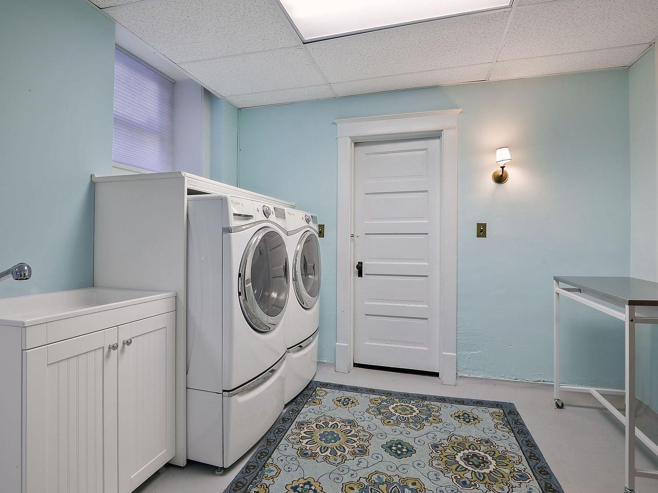 This laundry room features a soothing light blue color scheme that creates a calm atmosphere. Equipped with modern front-loading washing machines, the room includes a practical white cabinet beneath a workstation for folding clothes. A stylized area rug with intricate floral patterns adds warmth and texture to the space. Natural light streams in through a small window, enhancing the airy feel. A simple, stylish wall sconce provides additional lighting, contributing to the room’s overall functionality. A classic white door with panel detailing leads to another area, blending contemporary and traditional elements gracefully.