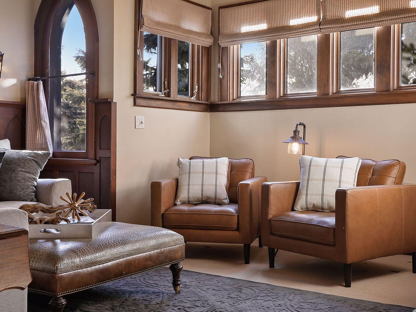 The living room showcases an inviting seating arrangement with two caramel-colored leather armchairs, accentuated by plaid throw pillows. A plush, earthy-toned ottoman with a textured leather finish complements the seating. Natural light streams through elegantly crafted arched windows, framed by soft beige curtains, enhancing the room’s warmth. Rich wood trim and window frames highlight vintage architectural details, while a dark patterned rug anchors the space. A subtle industrial-style lamp, placed strategically beside the chairs, adds an extra touch of charm. Neutral wall colors harmonize with the overall aesthetic, creating a cozy and welcoming atmosphere.