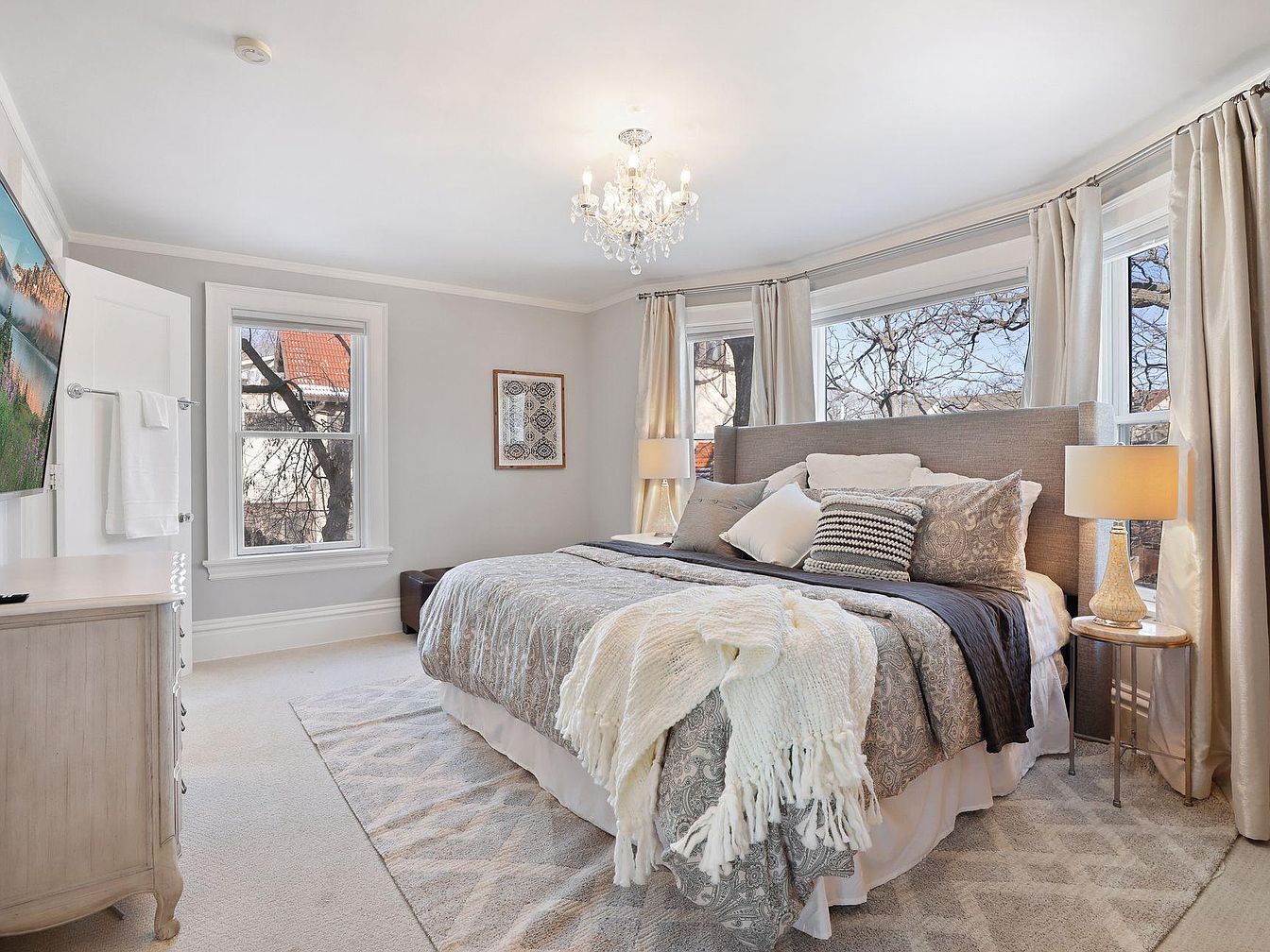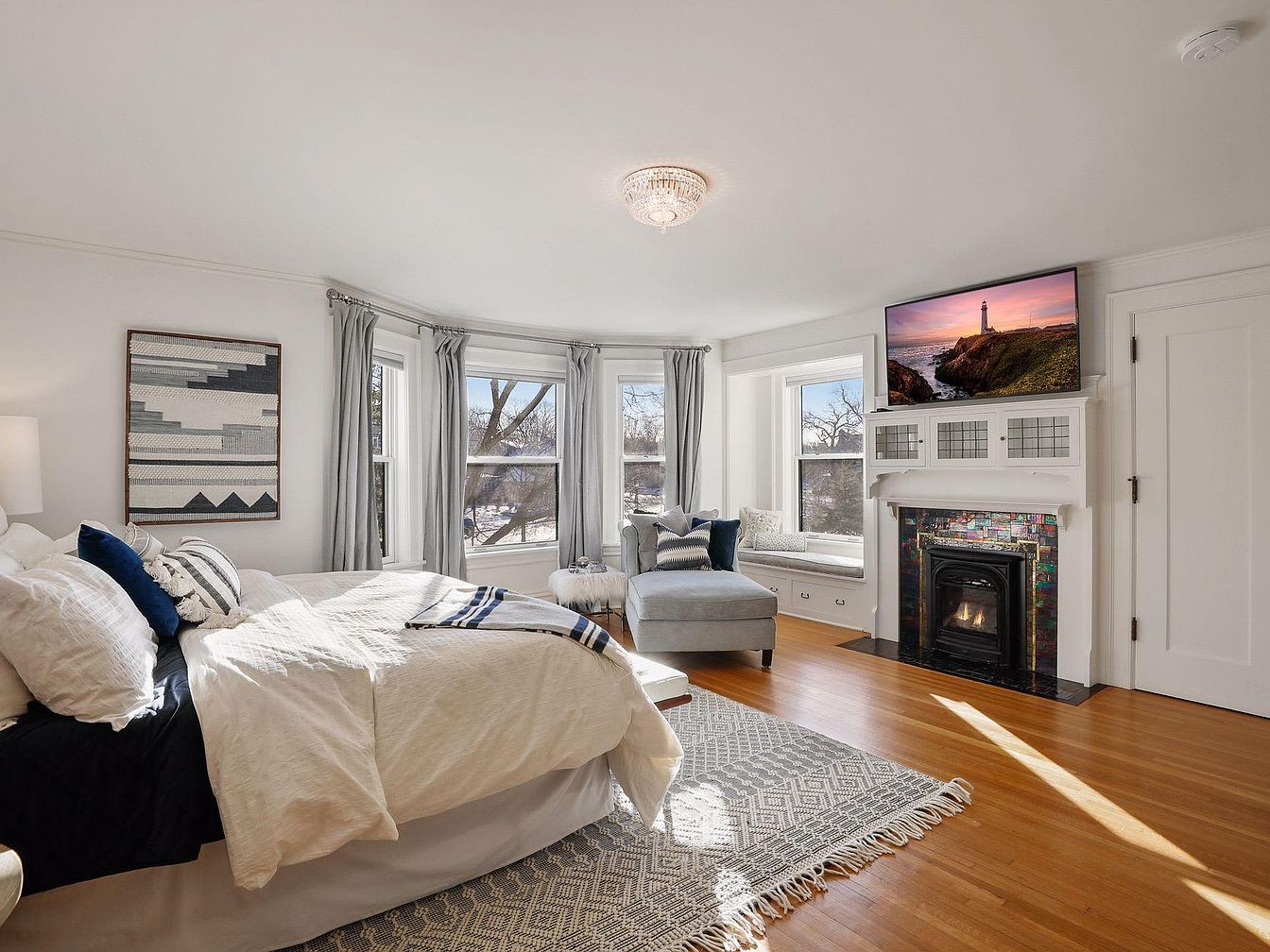 This bedroom showcases a blend of comfort and elegance. The spacious layout features a plush king-size bed with layered white and navy bedding, accentuated by decorative pillows. Natural light floods in through bay windows, enhanced by soft gray curtains. A cozy seating area includes a light gray chaise lounge and a small, textured rug beneath. The fireplace, framed by a striking colorful tile surround, adds warmth and character. A contemporary chandelier illuminates the space, while a piece of abstract wall art introduces a modern touch. Warm wooden floors contrast with the neutral palette, creating a soothing atmosphere.