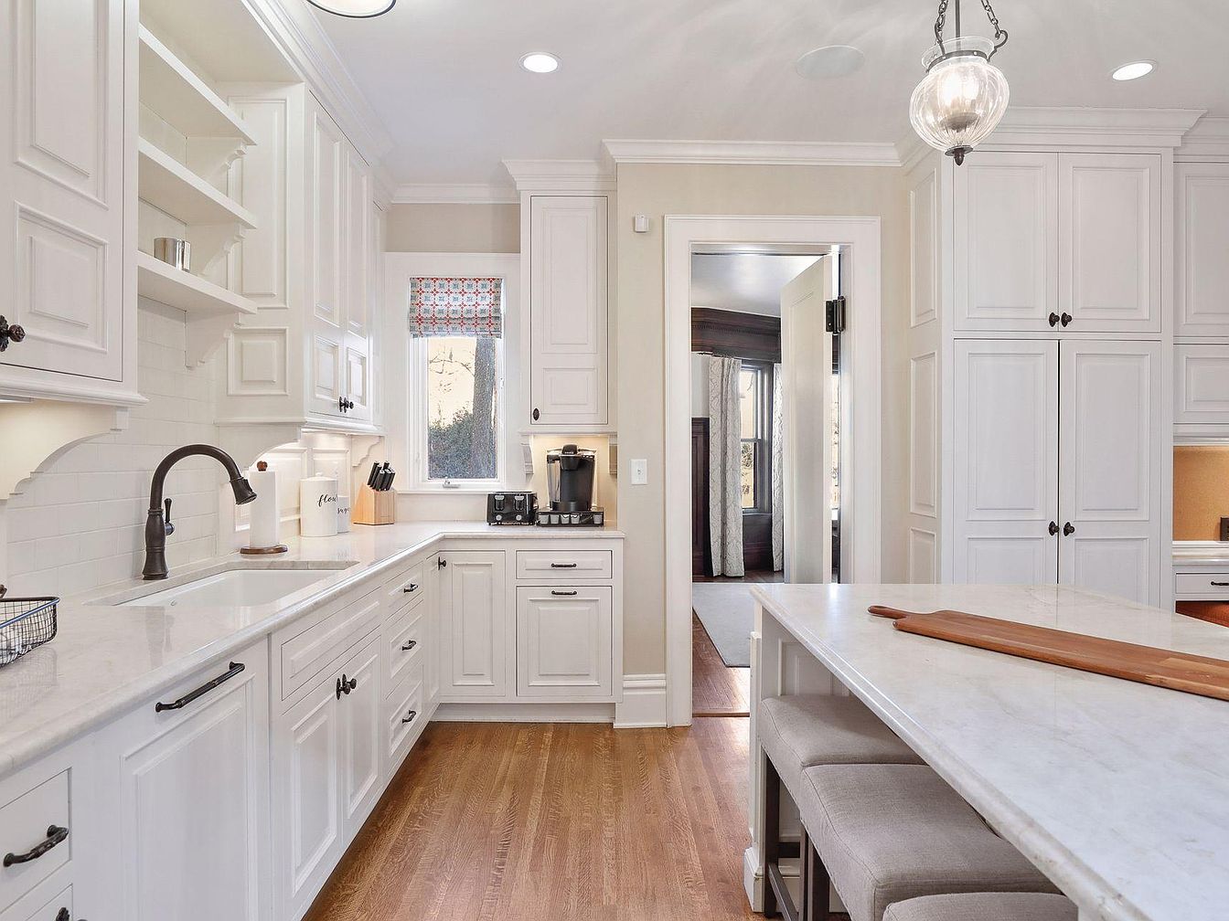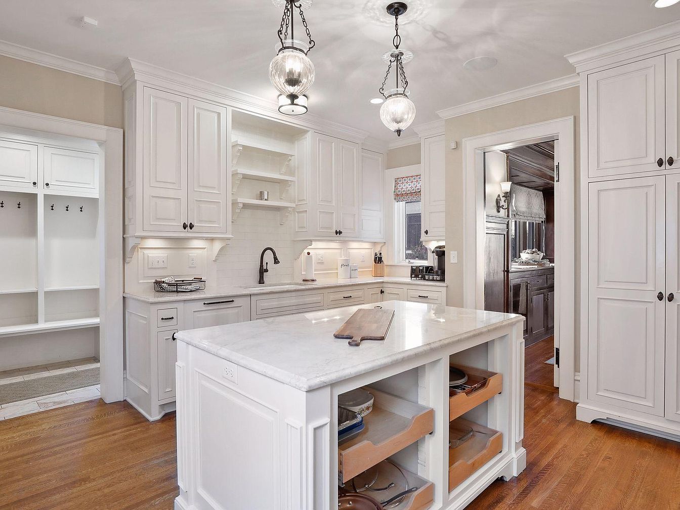 This kitchen features elegant white cabinetry with classic paneling, complemented by a subtle beige wall color. The center island, topped with a sleek marble surface, enhances functionality while offering an inviting space for meal preparation. Vintage-inspired pendant lights hang above, casting a warm glow throughout the area. To the left, a built-in mudroom with hooks provides a practical entryway solution. The backsplash is adorned with glossy white tiles, adding a touch of sophistication. The rich hardwood flooring balances the room’s light tones, while a seamless transition opens into an adjacent space, showcasing a cohesive design throughout the home.