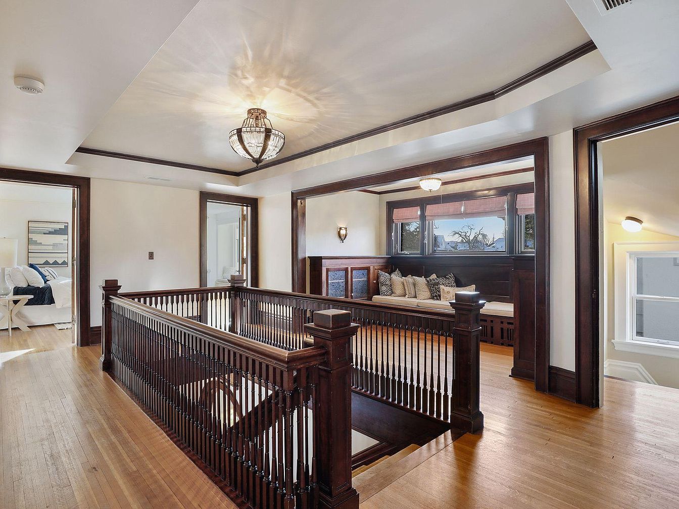 This upper landing showcases exquisite architectural detail, featuring rich dark wood railings contrasted against light hardwood flooring. A central chandelier illuminates the space, casting intricate shadows on the ceiling. The informal sitting area to the side invites comfort, adorned with plush cushions in neutral tones, framed by large windows that allow abundant natural light. Doorways lead into surrounding rooms, emphasizing the open design that enhances flow throughout the home. The walls are painted in a soft hue, subtly highlighting the intricate wooden trim and molding, which adds a touch of historic charm to this elegant transitional space.