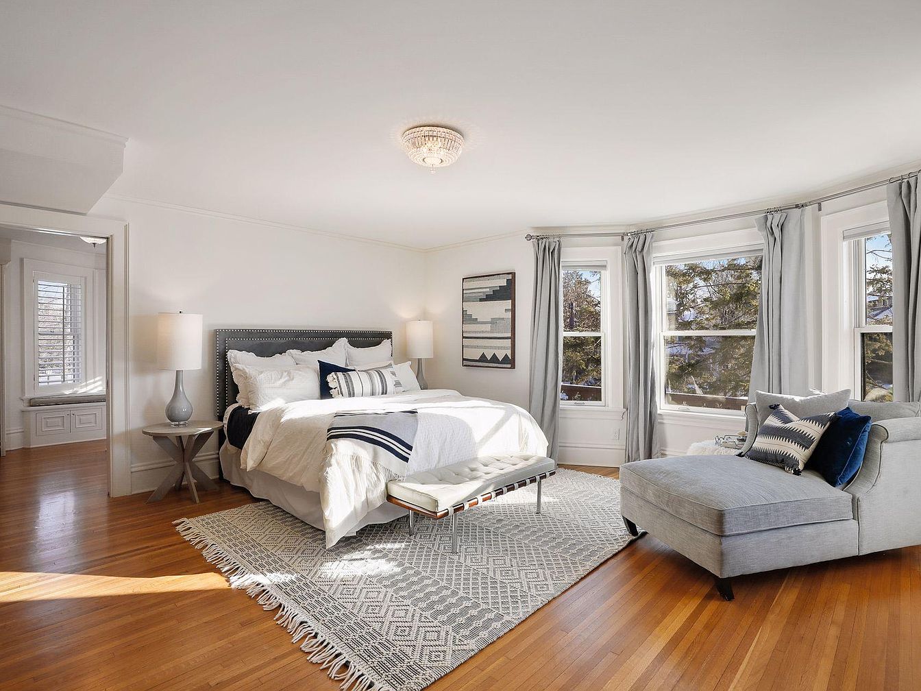 This spacious bedroom features a calming palette of whites and soft grays, complemented by natural wood flooring. A plush, gray upholstered bed with a tufted headboard is the room’s focal point, adorned with an array of white and navy accent pillows. Flanking the bed are elegant nightstands, each topped with modern table lamps that provide ambient lighting. A light, patterned area rug lies beneath the bed, adding texture. Large windows, dressed with sheer curtains, allow ample natural light, enhancing the airy feel. A cozy chaise lounge invites relaxation, and a piece of abstract art adds a contemporary touch.