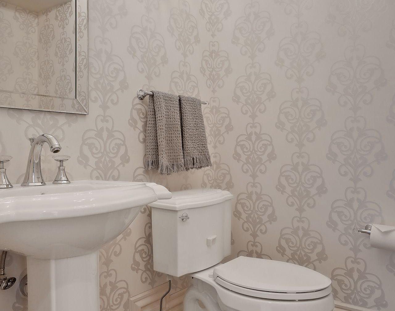 A stylish powder room features elegant design elements, highlighted by a soft, patterned wallpaper in muted tones. The color palette combines subtle grays and whites, exuding sophistication. A modern pedestal sink showcases sleek chrome fixtures, emphasizing a contemporary aesthetic. A plush gray towel hangs neatly on a chrome towel bar, adding a touch of warmth to the space. The toilet, with its clean lines, complements the overall decor. Above the sink, a framed mirror adds depth, reflecting light in the compact area. The architectural details contribute to a balanced and inviting atmosphere, making it ideal for guests.