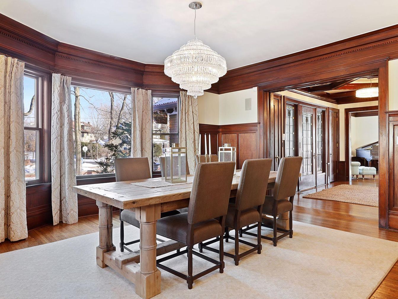 This dining room features rich wooden paneling and large, rounded bay windows that fill the space with natural light. An elegant chandelier hangs above a rustic wooden table surrounded by six upholstered chairs, creating a cozy yet sophisticated atmosphere. The warm brown tones of the wooden floors and trim contrast beautifully with lighter, textured curtains that cascade to the floor. A neutral area rug under the table adds softness, while decorative lanterns on the table enhance the inviting vibe. Architectural details, such as coffered ceilings, embody a blend of classic charm with contemporary comfort.
