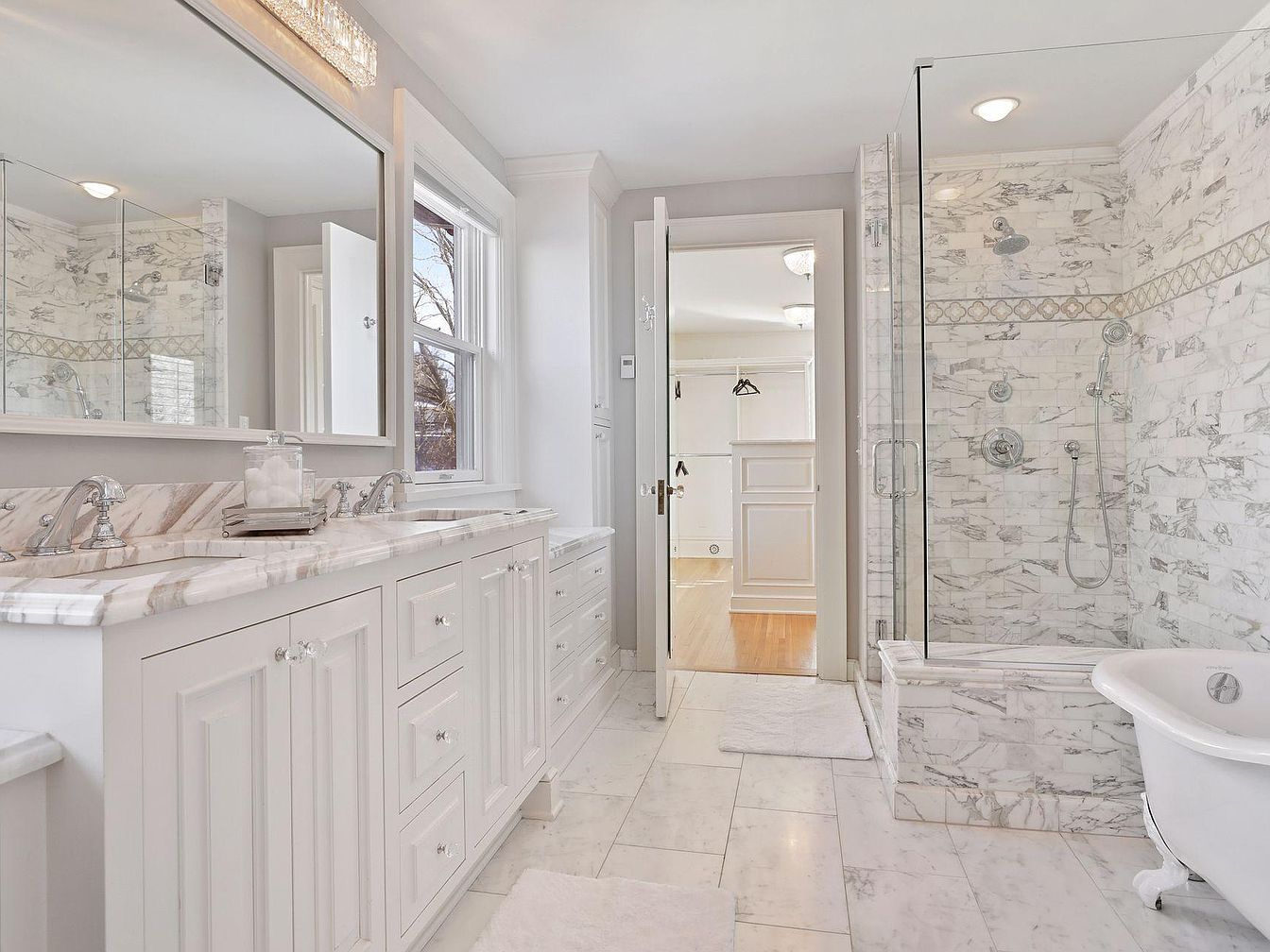 A bright, luxurious bathroom featuring a dual sink vanity crafted with sleek white cabinetry. The marble countertop, with delicate gray veining, complements the white walls and polished floor. A glass shower enclosure showcases intricate marble tiling, while a freestanding soaking tub highlights elegance with its classic design. Soft light filters through a nearby window, enhancing the airy feel. The color palette remains tranquil, with whites and grays dominating, accentuated by polished chrome fixtures. Plush bath mats and a minimalist decor add cozy warmth, creating a serene space perfect for relaxation and self-care.