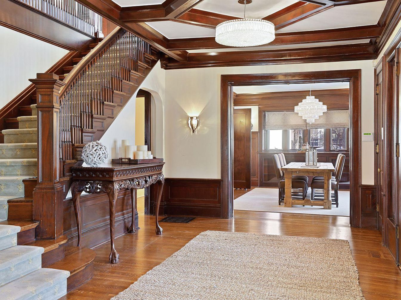 The entryway features an elegant wooden staircase with a beautifully crafted handrail, guiding visitors upwards. Rich mahogany paneling lines the walls, enhancing the classic aesthetic. A polished side table with intricate carvings sits against the wall, adorned with decorative candles and a sculptural orb. The flooring is a warm hardwood, complemented by a textured area rug that adds warmth and comfort. Natural light filters through a modern chandelier, creating a soft glow. The open doorway ahead reveals a dining area, showcasing a wooden table surrounded by upholstered chairs, suggesting a harmonious blend of timeless design and contemporary functionality.
