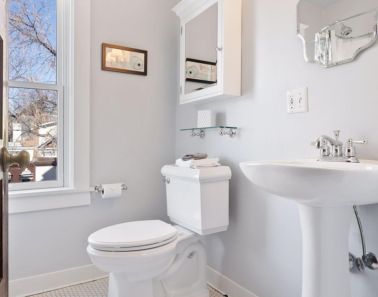 This small bathroom features a clean and modern aesthetic with a light gray color scheme, enhancing the sense of space. A white pedestal sink stands gracefully beside a sleek toilet, both contributing to a minimalist look. Complementary chrome fixtures add a touch of elegance, including a small mirror above the sink that echoes the room’s streamlined design. A glass shelf mounted on the wall provides functional storage, while neatly folded towels enhance the decor. Natural light floods in through a window, creating a serene atmosphere. Subtle architectural details such as moldings further enrich the charming character of this quaint space.