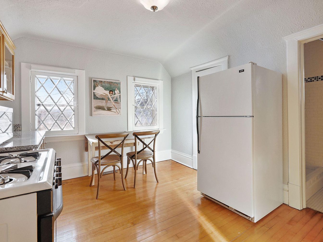 This kitchen showcases a seamless blend of historic charm and modern functionality. Light gray walls contrast with the warm, polished wood flooring, creating an inviting atmosphere. A black and white gas stove stands out against the granite countertop, which adds sophistication. Natural light streams through two diamond-patterned windows, illuminating a cozy dining nook with two wooden chairs and a small table. A white refrigerator complements the cabinetry, which features light wood tones for a classic touch. An artwork piece adds personality to the space, enhancing the homey feel and artfully bridging the classic and contemporary design elements.