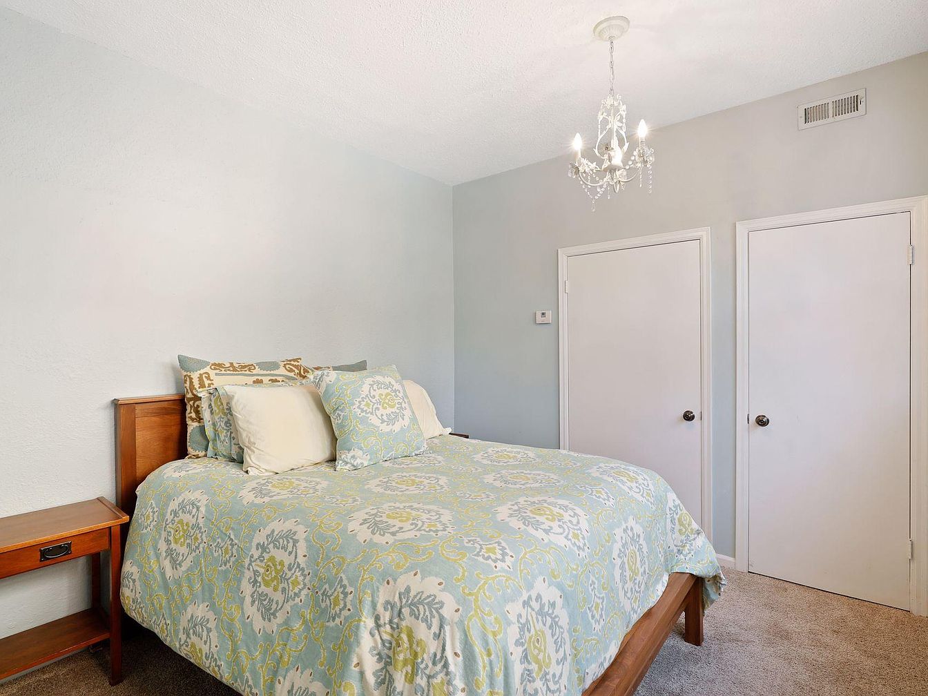 This cozy bedroom features a charming layout with a large bed adorned in a blue and yellow floral patterned duvet, complemented by several decorative pillows. A rich wooden bed frame and a matching side table provide warmth to the space. The walls are painted in a soothing light gray, enhancing the serene atmosphere. A delicate chandelier hangs from the ceiling, adding a touch of elegance. Two white doors lead to additional storage, seamlessly blending into the room’s aesthetic. Soft gray carpeting underfoot adds comfort, while the overall decor reflects a tranquil and inviting retreat.