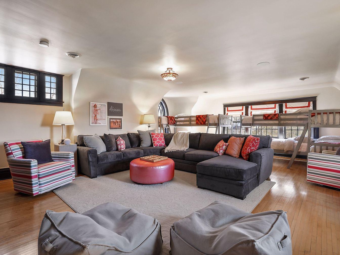This space serves as a cozy guest room featuring a large sectional sofa in a deep gray tone, accented by bright cushions in shades of coral and pink. A round, blush-colored ottoman enhances the seating area, creating a welcoming ambiance. Two striped armchairs add a playful touch, mirroring the room’s vibrant palette. Natural light floods in through large windows adorned with bold red and white curtains. A pair of elegant lamps flank the sofa, casting a warm glow. The room includes bunk beds in the background, indicating a perfect blend of style and functionality for various guests.