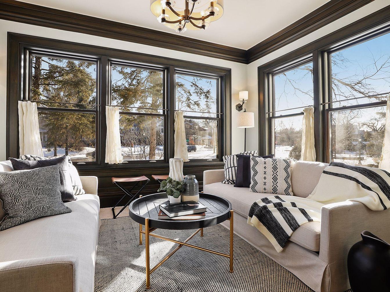This sunroom features large, expansive windows framed in dark wood, allowing natural light to fill the space. A cozy arrangement includes two light-colored sofas adorned with textured throw pillows in black and white patterns. A chic round coffee table with a gold base sits at the center, showcasing a decorative plant and books. The floor is complemented by a patterned area rug that adds warmth. Soft, sheer curtains drape elegantly alongside the windows, enhancing the inviting atmosphere. The ceiling displays a contemporary light fixture, while the contrast of dark trim against light walls creates a striking visual appeal.