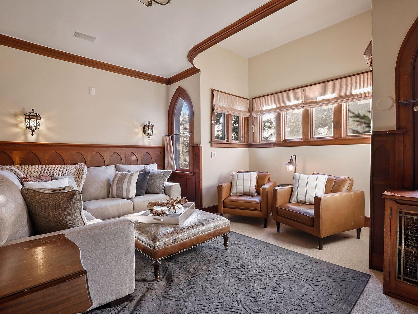 Cozy living room featuring a blend of modern comfort and historic charm. The space showcases a beige sectional sofa adorned with various textured pillows, complemented by a classic brown leather ottoman. Rich wooden trim lines the walls, accentuating the architectural details. Two leather armchairs, each with soft plaid cushions, provide additional seating. Large windows, adorned with soft shades, allow natural light to filter through, enhancing the warm ambiance. Decorative lantern-style wall sconces add vintage flair. A plush area rug with intricate patterns anchors the furniture, creating a welcoming atmosphere for relaxation and conversation.