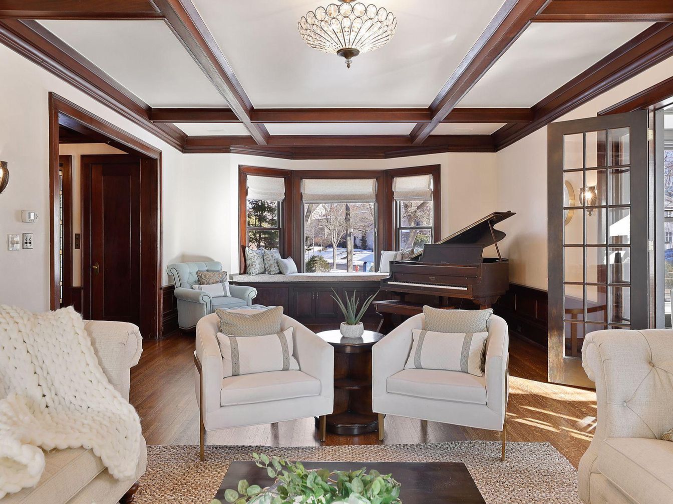 This living room combines elegance and comfort with a warm color palette of beige, white, and rich wooden tones. A coffered ceiling adds architectural interest above, while ample natural light floods in through the bay window adorned with plush cushions. The furnishings include a soft white sofa layered with a chunky throw, two modern armchairs with subtle patterns, and a stylish coffee table. A grand piano rests against the wall, complemented by a simple vase of greenery. Hardwood flooring contributes to the cozy ambiance, while French doors open to additional spaces, enhancing the room’s openness.