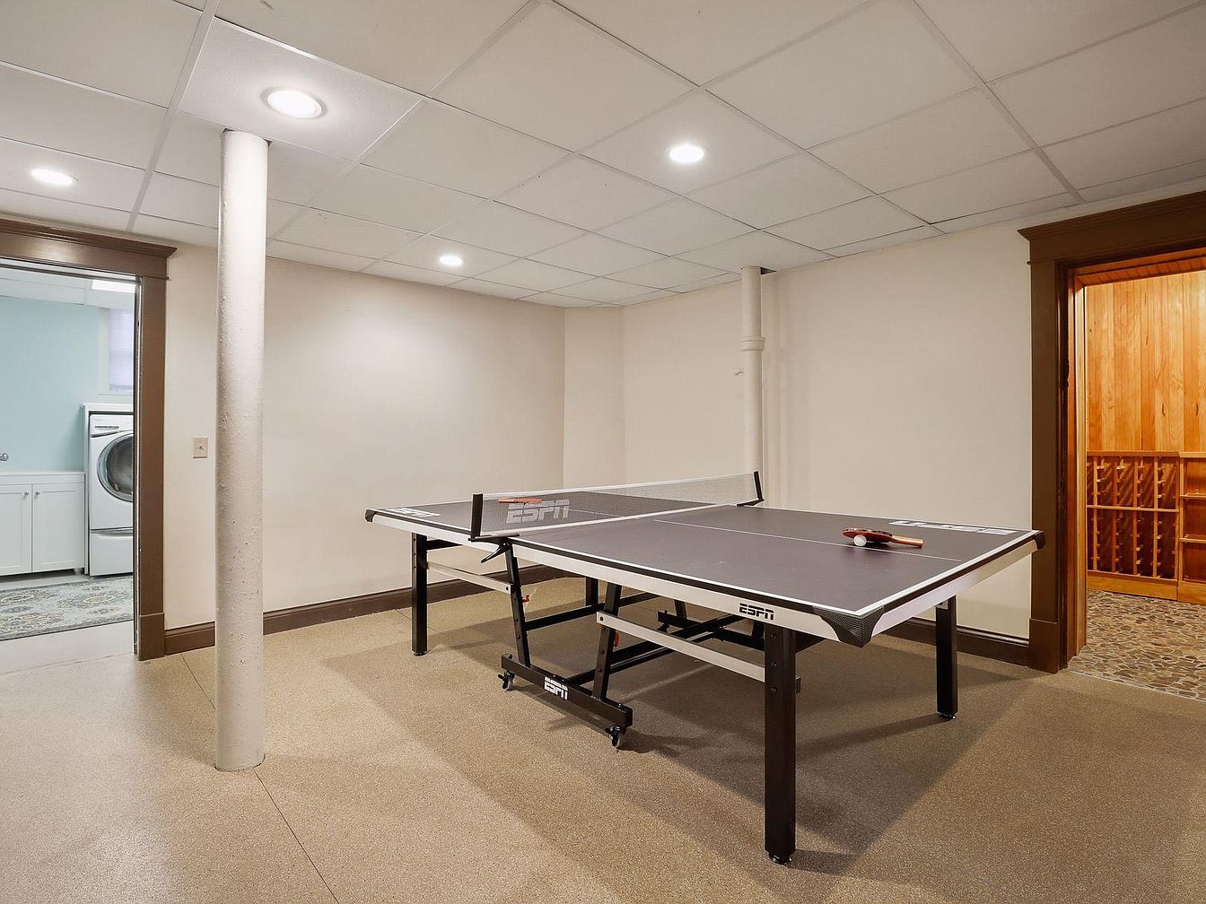 The space features a versatile recreation room highlighted by a black ping pong table at its center. Surrounding elements include a polished concrete floor that enhances the modern feel. A supporting pillar stands prominently, adding structural interest to the design. The walls are painted in soft neutral tones, providing a calming backdrop. To one side, a glimpse of a nearby laundry area reveals white cabinetry, contributing to the room’s functionality. Architectural details include crown molding in a dark wood finish, contrasting with the lighter walls, while the ceiling boasts recessed lighting for a bright and inviting atmosphere.