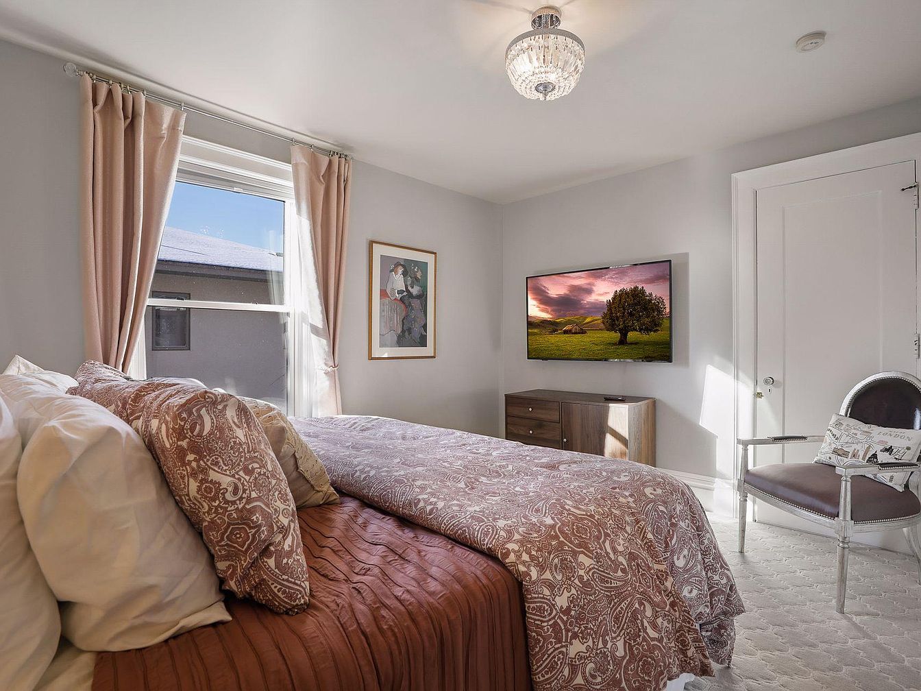 This bedroom features a cozy, inviting layout, enhanced by a harmonious color palette of soft grays and warm browns. A textured, patterned bedspread in rich rust is layered with fluffy white pillows, creating a plush and comfortable appearance. Natural light pours in through a window adorned with pink curtains, brightening the space. A modern flat-screen TV hangs on the wall across from the bed, providing entertainment. A sleek wooden dresser complements the decor, while a stylish accent chair with a cushioned seat adds elegance. The ceiling boasts a sparkling chandelier, contributing to the room’s chic, contemporary charm.