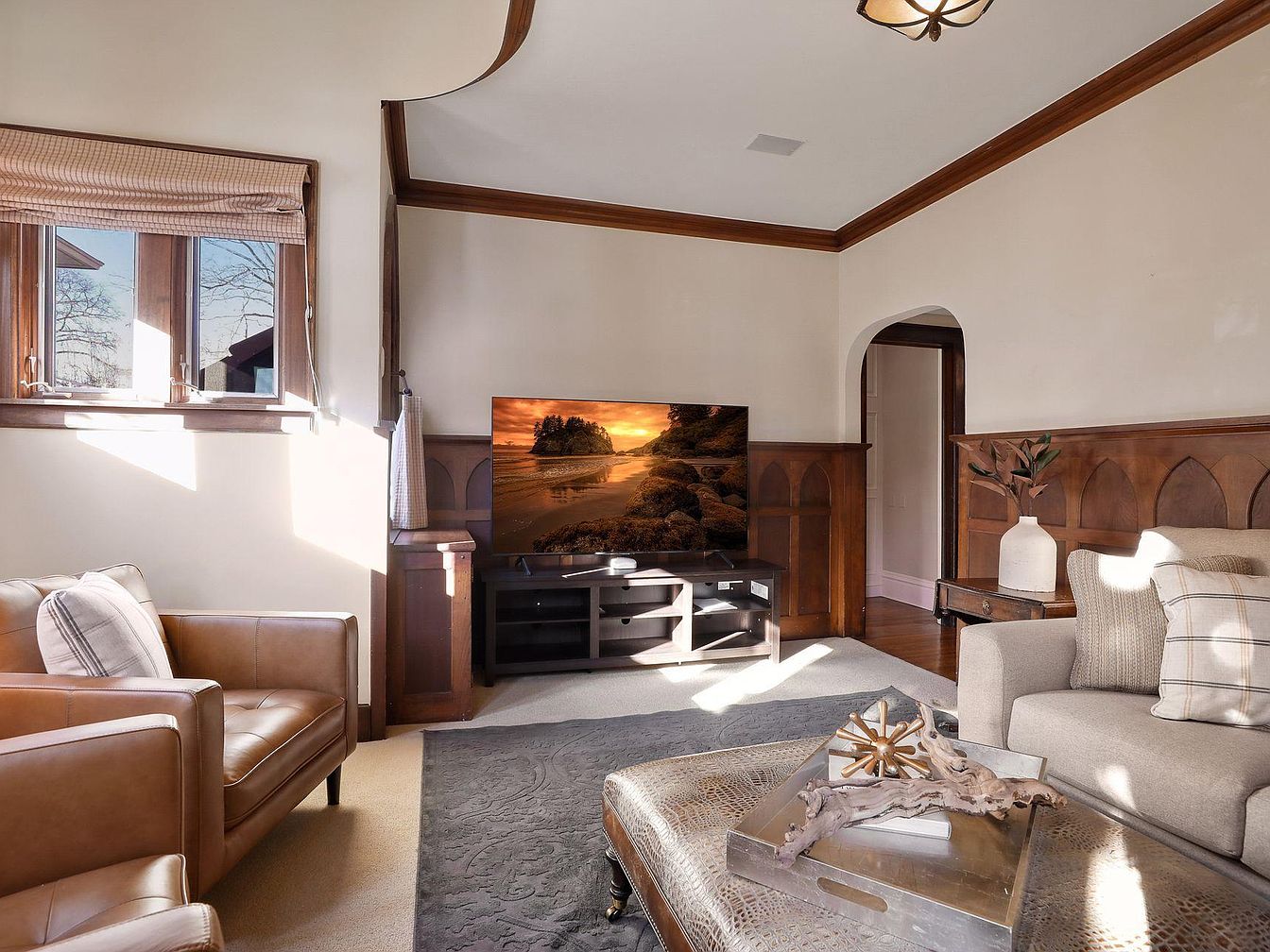The living room features a warm color palette with neutral tones complemented by rich wooden accents. A plush beige couch and a brown leather armchair provide cozy seating options, enhanced by decorative throw pillows. A textured gray area rug lies beneath a sleek, modern coffee table adorned with natural decor elements. The room is illuminated by natural light streaming through large windows, framed by classic wooden trim. A flat-screen TV is mounted against a paneled wall with Gothic-style arches, adding character. An elegant light fixture hangs from the ceiling, contributing to the room’s inviting and stylish atmosphere.