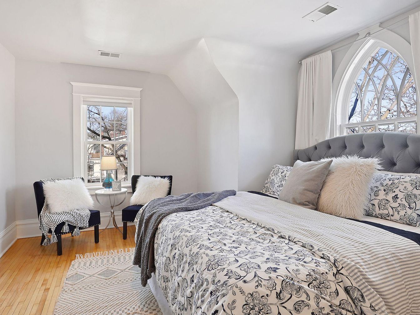 A cozy bedroom featuring a soft gray wall that enhances the spacious feel. A plush, tufted headboard adds elegance, while white bedding with intricate floral patterns creates a calming atmosphere. Two navy blue chairs, adorned with fluffy white throws, invite relaxation beside a small, round table with a soothing lamp. The large arched window allows natural light to illuminate the room, and sheer white curtains frame the view, connecting the indoors with the outdoors. A neutral, textured area rug complements the natural wood flooring, unifying the modern and classic elements to create a serene, inviting space.