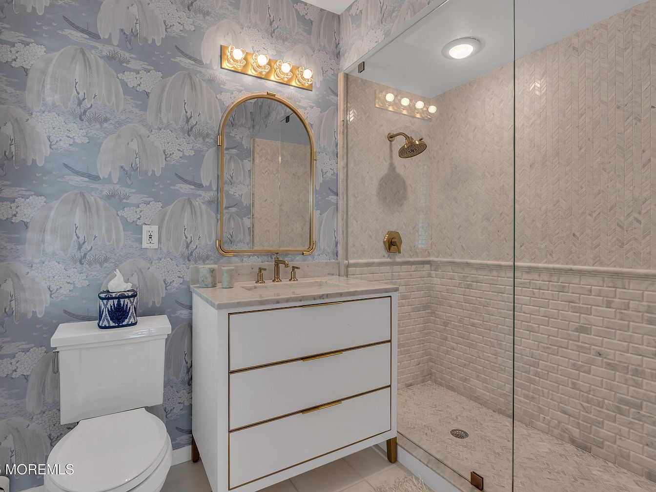 This bathroom features a serene blue wallpaper adorned with soft, artistic motifs of willow trees, providing a tranquil backdrop. A chic, white vanity with sleek, gold hardware complements the aesthetic, while a polished mirror with a gold frame adds elegance. The shower area showcases beautiful herringbone-patterned tiles in light hues, harmonizing with the surrounding elements. A glass partition enhances openness and light, while a modern overhead light fixture bathes the space in a warm glow. The polished, white toilet contrasts with a decorative blue and white ceramic container, creating a sense of style and functionality in this compact retreat.