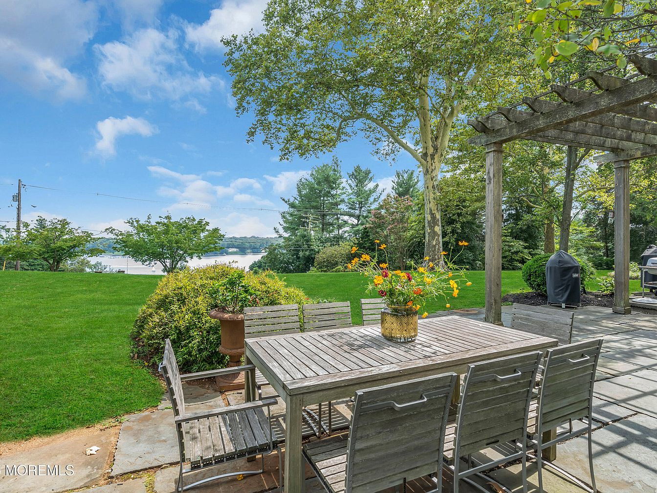 A spacious outdoor patio offering a serene view of a lush green yard and a shimmering water body in the distance. The space features a weathered wooden dining table surrounded by metal chairs, perfect for gatherings. A decorative vase filled with vibrant flowers adds a splash of color against the natural backdrop. Above, a rustic pergola provides a charming architectural detail, enhancing the outdoor atmosphere. The carefully maintained grass is interspersed with flowering shrubs, contributing to the inviting feel of the area. This patio seamlessly blends relaxation with natural beauty, ideal for enjoying warm evenings.