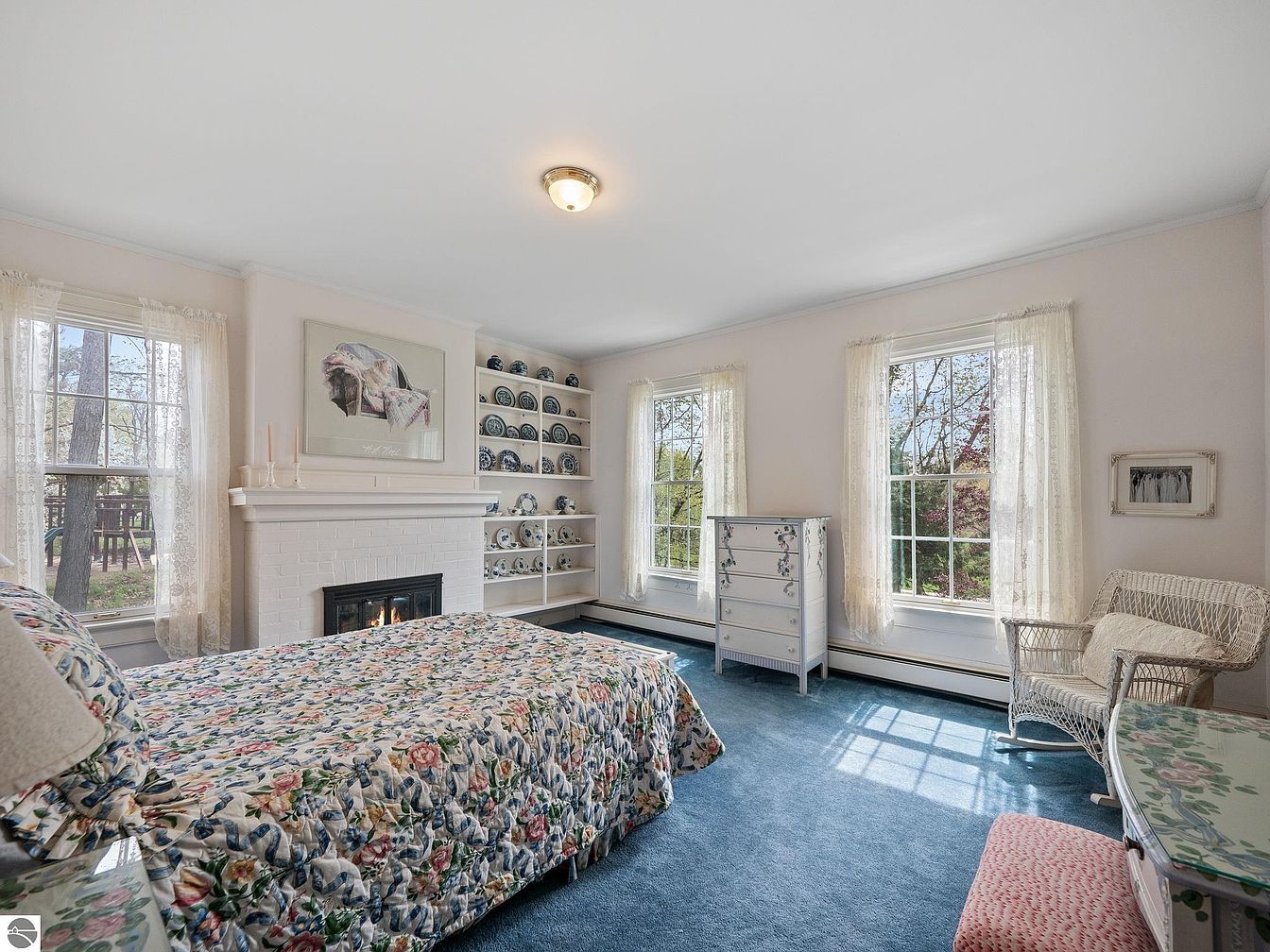 This bedroom features a floral-patterned bedspread in soft pastels, complementing the light blue carpet. A cozy white brick fireplace serves as a focal point, adorned with two elegant candles. Natural light floods the space through large windows with sheer lace curtains, creating a serene atmosphere. A built-in shelf showcases decorative blue and white plates, adding character to the room. A vintage dresser painted in delicate floral motifs stands beside the bed, while a wicker chair and a small table invite relaxation. The overall aesthetic exudes a charming blend of comfort and classic elegance, ideal for a tranquil retreat.