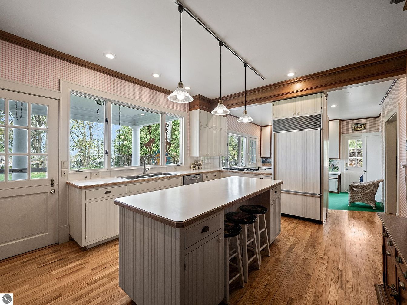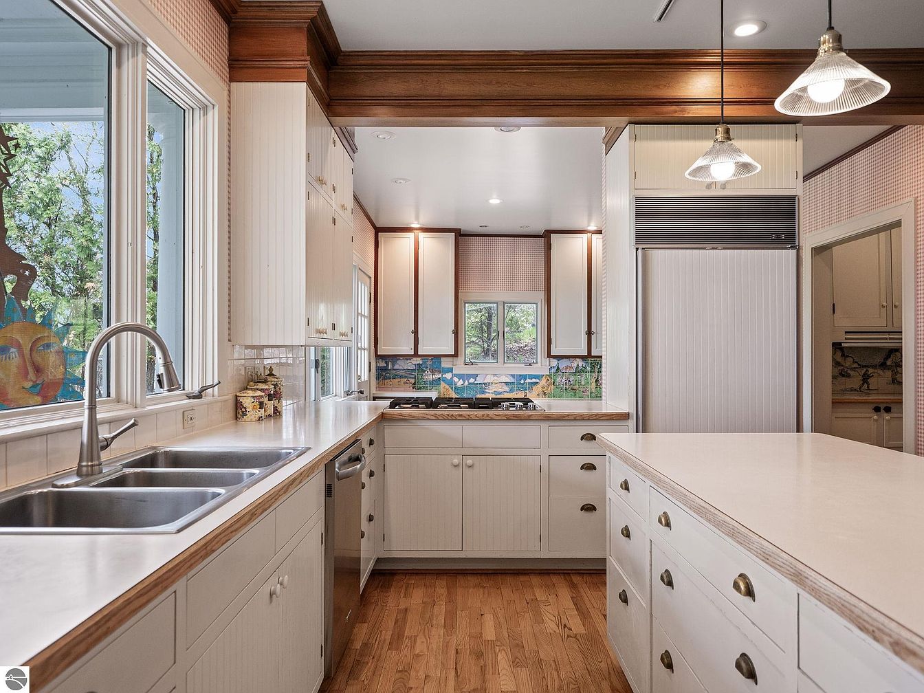 This kitchen features a bright and airy layout with large windows allowing natural light to flood the space. The cabinetry is a soft white with beadboard texture, complemented by polished wood accents. A spacious white countertop pairs seamlessly with the stainless steel appliances. The island stands out with a warm wood surface, providing a functional work area. Two pendant lights hang above, adding a rustic charm. Backing the sink area, a colorful tile mural brings life and personality to the kitchen. The warm wood flooring adds warmth and continuity, enhancing the inviting atmosphere of this home.