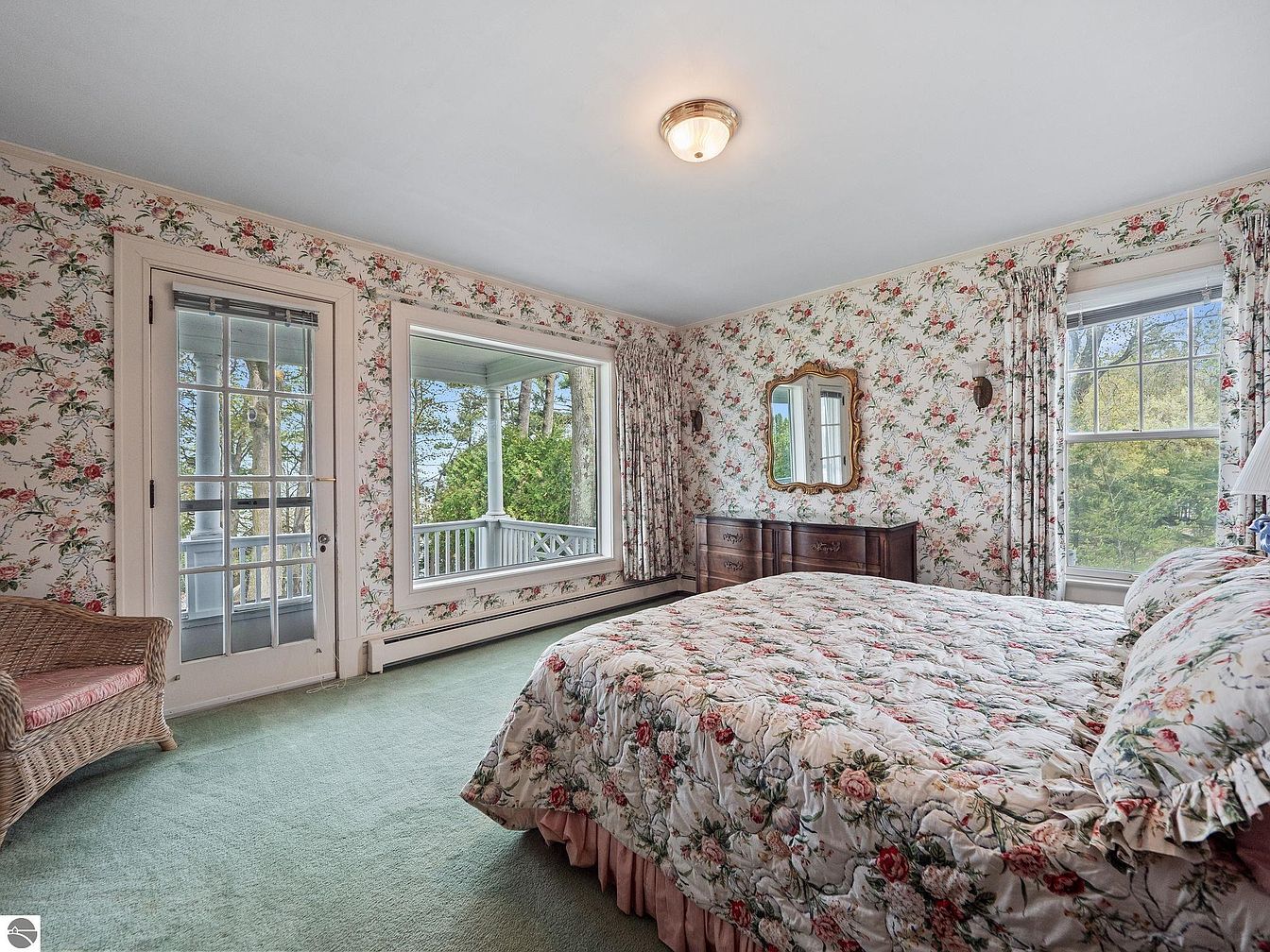 This bedroom exudes a classic charm with floral wallpaper that features pink and green hues, creating a vibrant yet cozy atmosphere. A plush green carpet adds warmth to the space, complementing the pastel colors of the decor. The furniture includes a wooden dresser adorned with elegant detailing, reflecting traditional design. Large windows offer abundant natural light and showcase a serene view of the outdoors, framed by coordinating floral drapes. A wicker chair in the corner provides a quaint reading nook. The overall design harmonizes vintage aesthetics with comfort, inviting relaxation and tranquility.