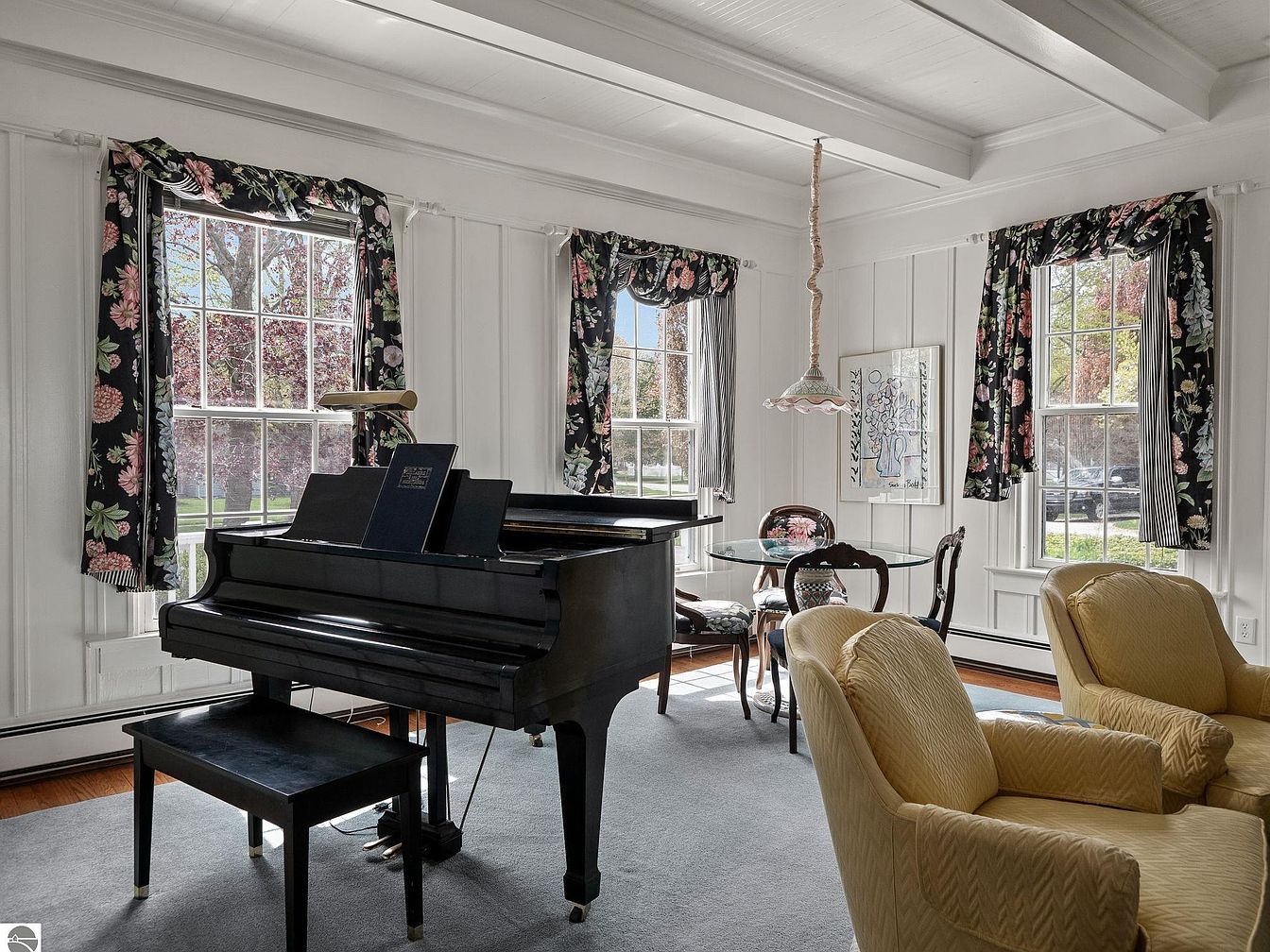 This elegant music room features a grand black piano positioned by large windows adorned with floral-patterned drapes that frame natural light beautifully. The space is enriched with a soft gray carpet underfoot, complementing the warm wooden floors visible at the edges. To one side, a round dining table with vintage-style chairs offers a cozy gathering spot. Soft yellow armchairs provide comfortable seating, balancing the darker tones of the piano and decor. A whimsical pendant light hangs above the table, while a framed artwork adds a splash of color to the white paneled walls, enhancing the inviting atmosphere.