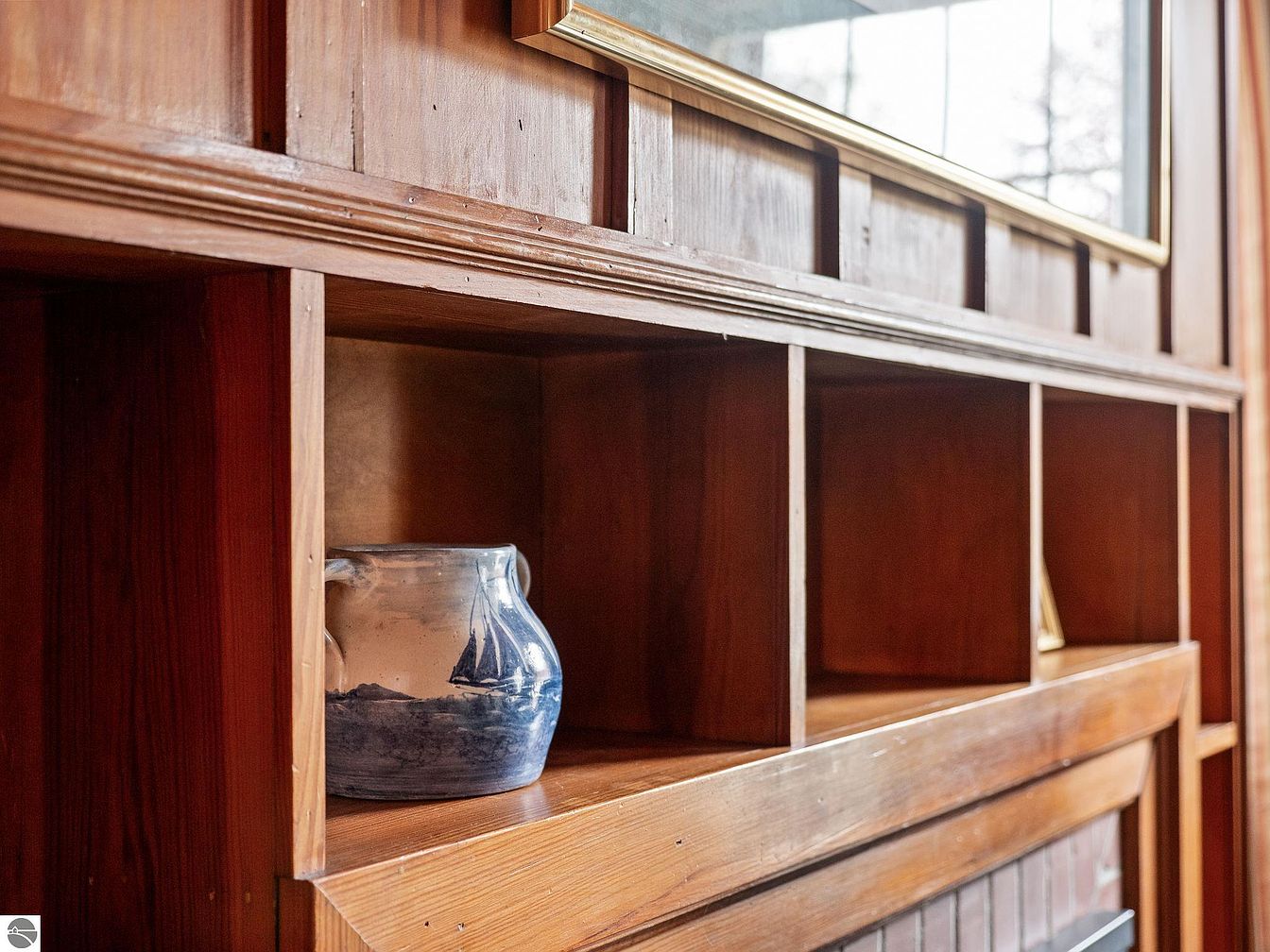 This is a segment of a living room featuring refined wood paneling that exhibits rich tones, likely from mahogany or cherry. A series of open shelving units frame a central area, which hints at a cozy fireplace below. The shelves showcase an elegant blue pottery piece, adorned with a nautical design, adding charm and character. Above the shelves, a decorative mirror reflects natural light, enhancing the space’s brightness. The craftsmanship showcases clean lines and subtle details of molding, contributing to a warm, inviting atmosphere. Overall, this area serves as a stylish focal point in the room.