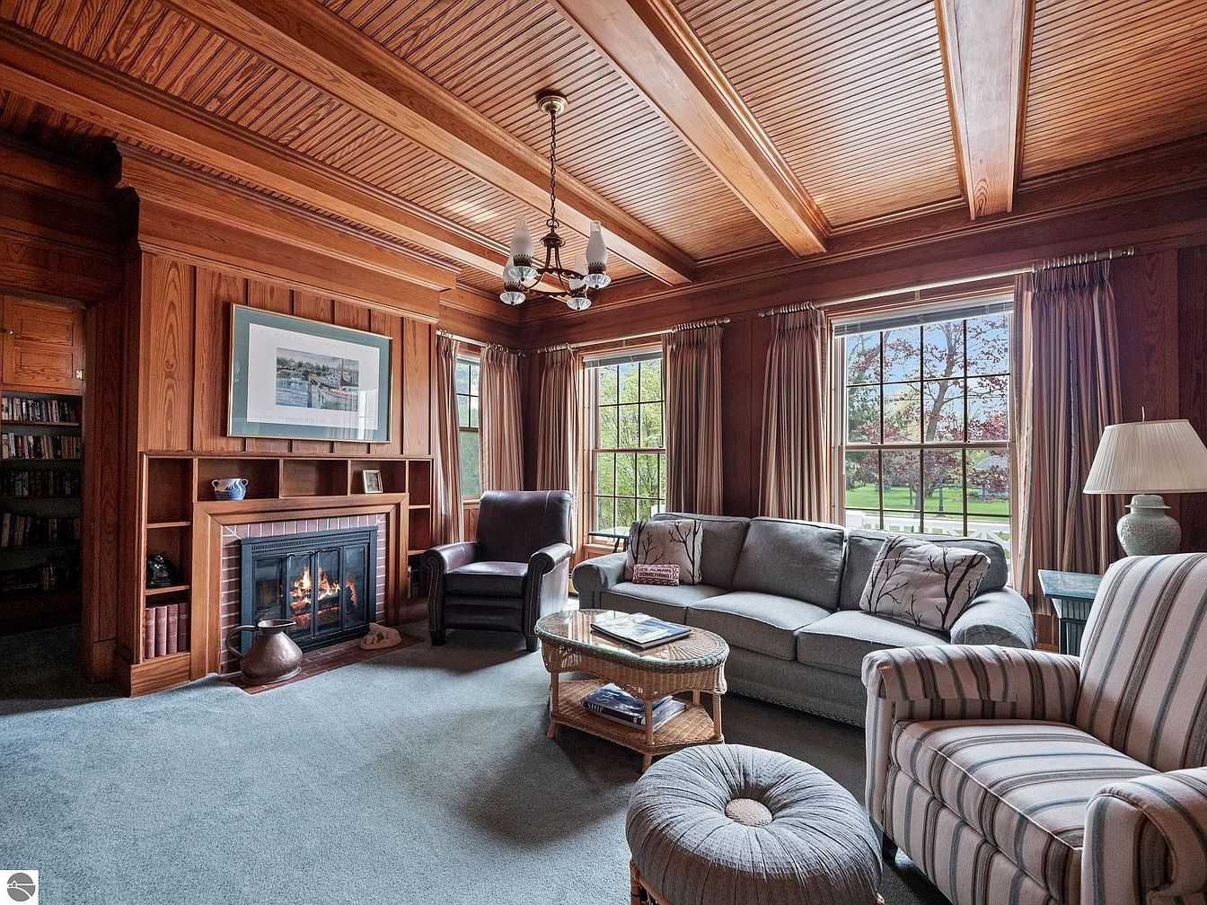 This inviting living room features rich wooden paneling and a coffered ceiling, emphasizing the historic charm of the space. A large, comfortable sectional sofa with decorative pillows faces an elegant stone fireplace, creating a cozy atmosphere. Natural light floods in through expansive windows adorned with soft drapes, revealing a picturesque view of the greenery outside. A round glass-top coffee table sits atop plush carpeting, adding a touch of sophistication. Beside the fireplace, built-in shelves showcase books and a decorative ceramic piece, enhancing the room’s homely appeal. An armchair with a deep seat complements the relaxed seating arrangement.