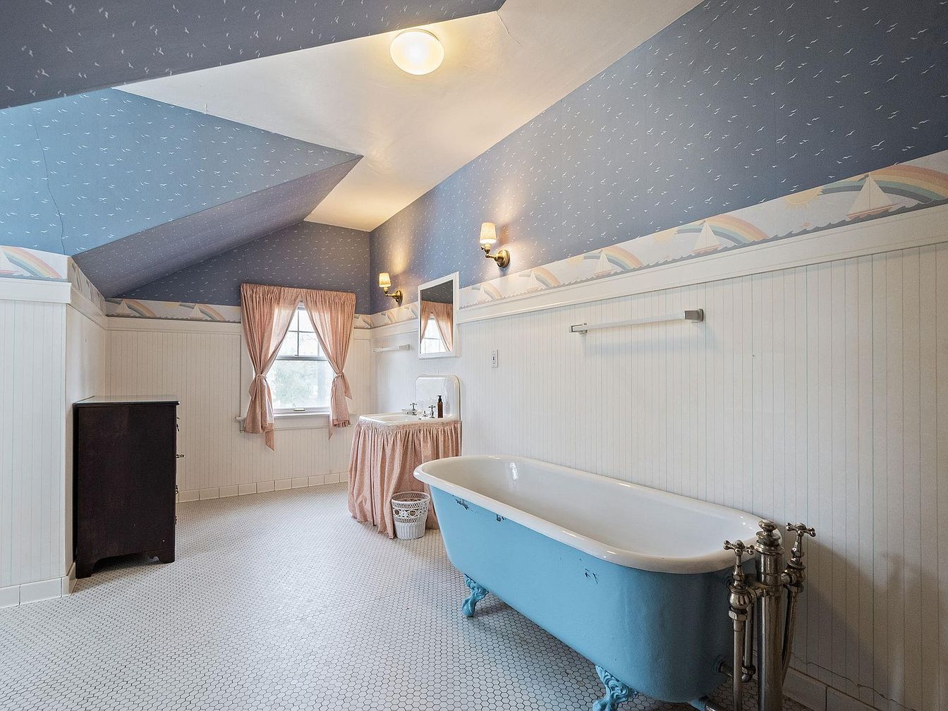 A charming, vintage bathroom showcases a clawfoot tub with a strikingly light blue exterior and a pristine white interior, complemented by elegant chrome fixtures. The ceiling is steeply angled, accentuating the cozy feel, while the walls are adorned with pastel wallpaper, featuring a nautical theme of small boats and clouds. Soft, blush curtains frame the window, providing a delicate contrast to the blue tones above. A round mirror hangs above a pastoral sink area, complemented by a frilled skirt. The floor features intricate white hexagonal tiles, enhancing the overall vintage aesthetic of the space.
