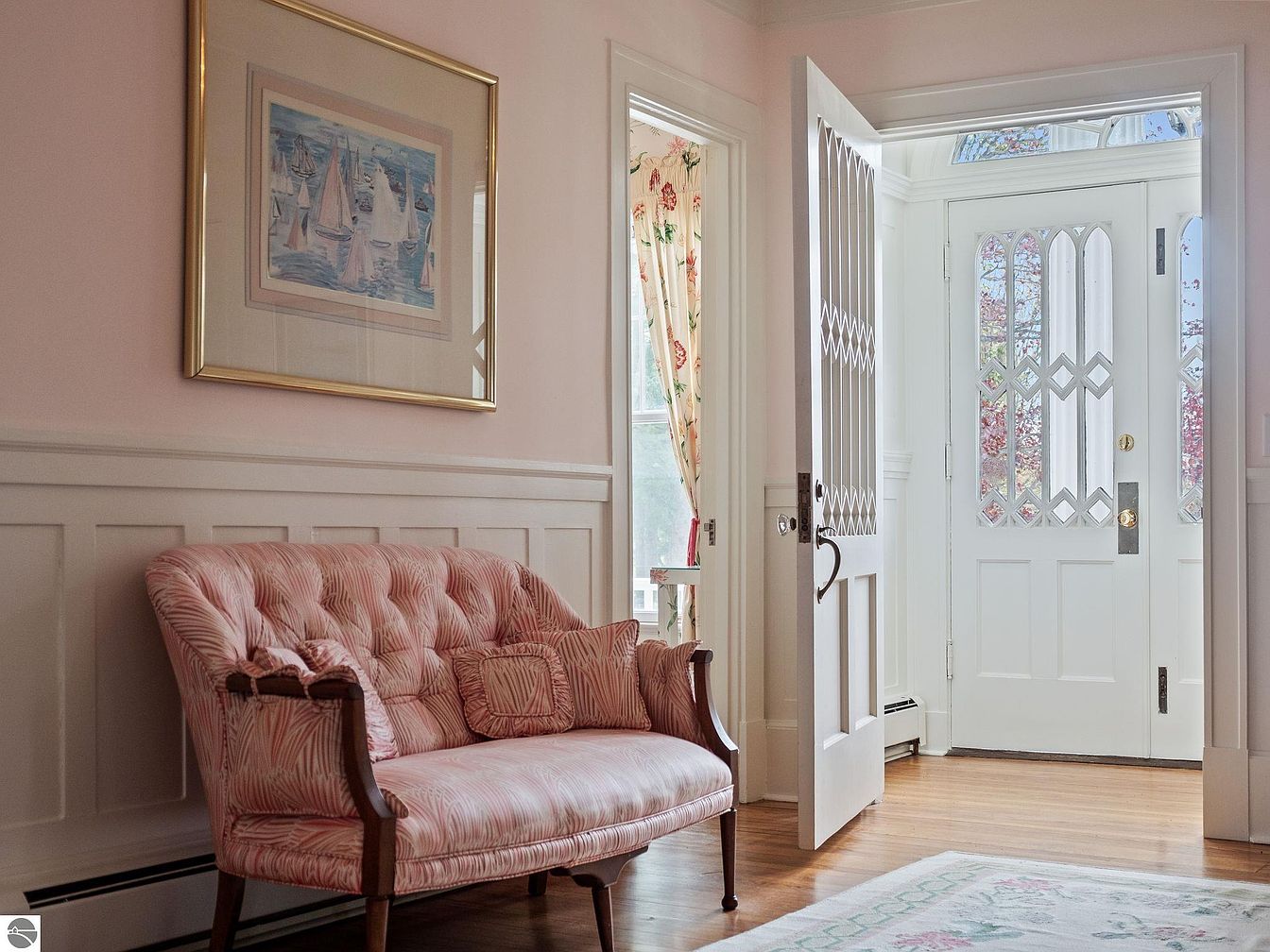 The entryway features a charming combination of pastel pink walls and elegant white wainscoting, creating a soft, inviting atmosphere. A tufted pink settee, adorned with decorative cushions, provides a cozy seating area. The open doorway reveals an intricately designed front door, showcasing diamond-shaped glass panels that invite natural light. To the left, floral-patterned curtains frame a window, adding a touch of whimsical color. A subtle area rug underfoot features a delicate floral design, enhancing the room’s vintage aesthetic. Architectural details like crown molding elevate the space, harmonizing with the overall classic American home theme.