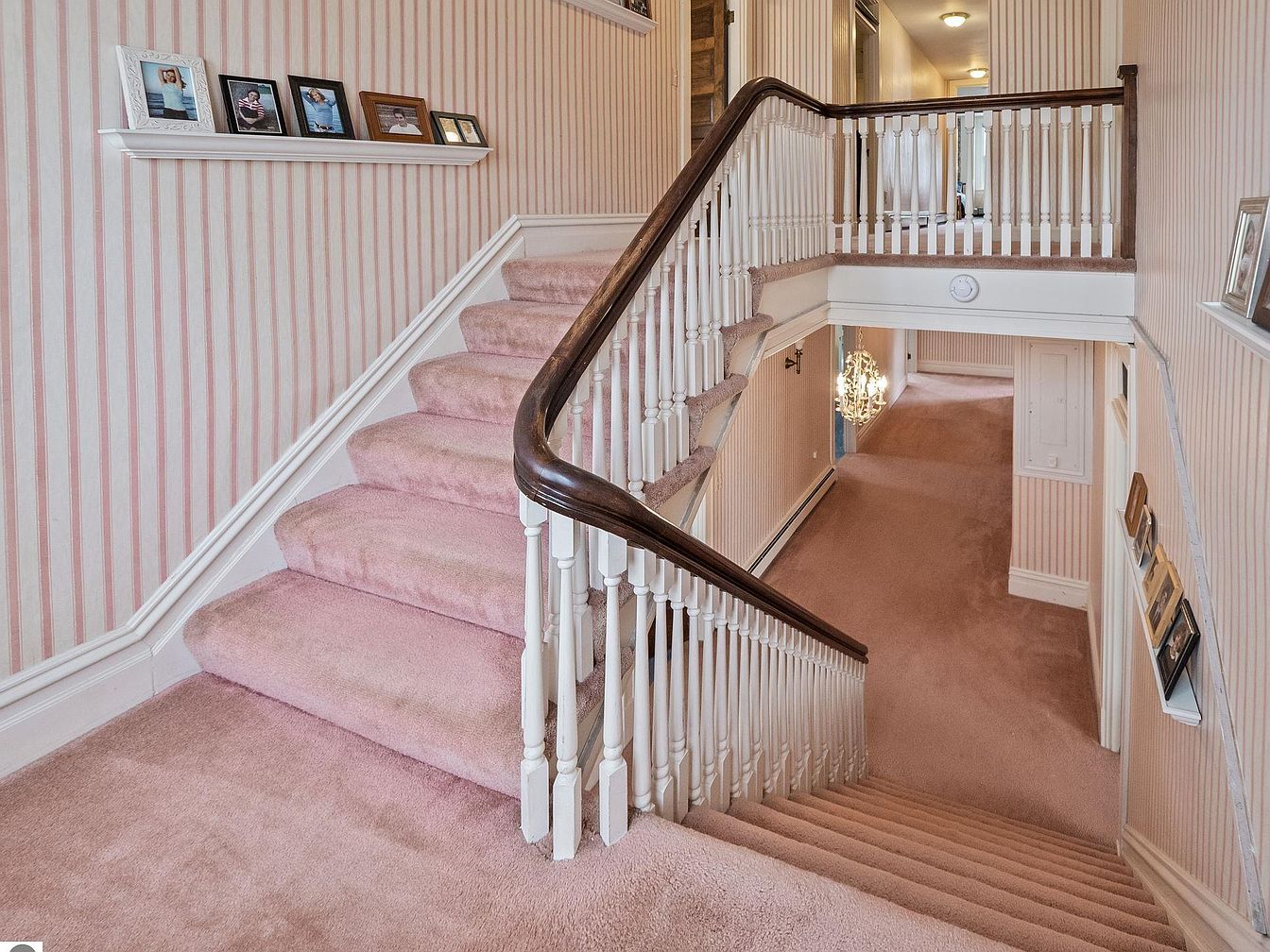 A carpeted staircase gracefully ascends with soft pink hues, complemented by white painted wooden railings. Vertical striped wallpaper in light pink adds a sense of charm along the walls, while decorative frames displaying family photographs line a shelf above the stairs. The upper landing opens into a softly lit hallway, featuring more pastel tones that harmonize with the staircase. At the bottom, the plush carpeting continues, offering a cozy atmosphere. A chandelier subtly illuminates the space, creating an inviting feel as the staircase connects different levels of this historic home, showcasing its elegant architectural details.