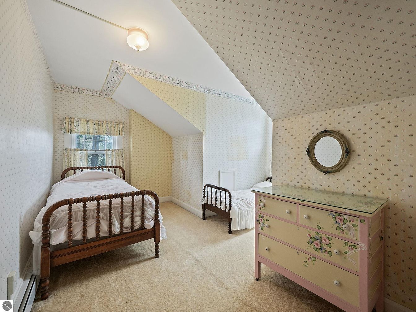 The space features a cozy, vintage charm with sloped ceilings, accentuated by soft pastel yellow wallpaper adorned with delicate floral patterns. Two wooden beds with intricate spindles invite relaxation, while a charming dresser painted in light pink with floral embellishments provides storage. A round mirror enhances the room’s light, reflecting natural sunlight from the nearby window dressed in matching floral curtains. The soft beige carpet underfoot adds warmth and comfort, complementing the overall serene atmosphere. The combination of antique furniture and whimsical decor creates a welcoming retreat, embodying a timeless aesthetic reminiscent of a bygone era.