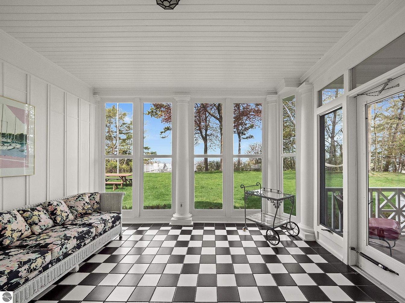 A bright and airy sunroom features large windows framed in white, allowing sunlight to flood the space and offering panoramic views of the surrounding greenery. The floor is adorned with a classic black and white checkered pattern that adds a modern touch to the traditional feel. A long, floral-patterned sofa with a wicker base provides comfortable seating, enhancing the room’s inviting ambiance. A small, elegant rolling cart stands ready for refreshments. Architectural details include decorative moldings and a paneled ceiling, reinforcing the historic character while blending seamlessly with the serene outdoor landscape.