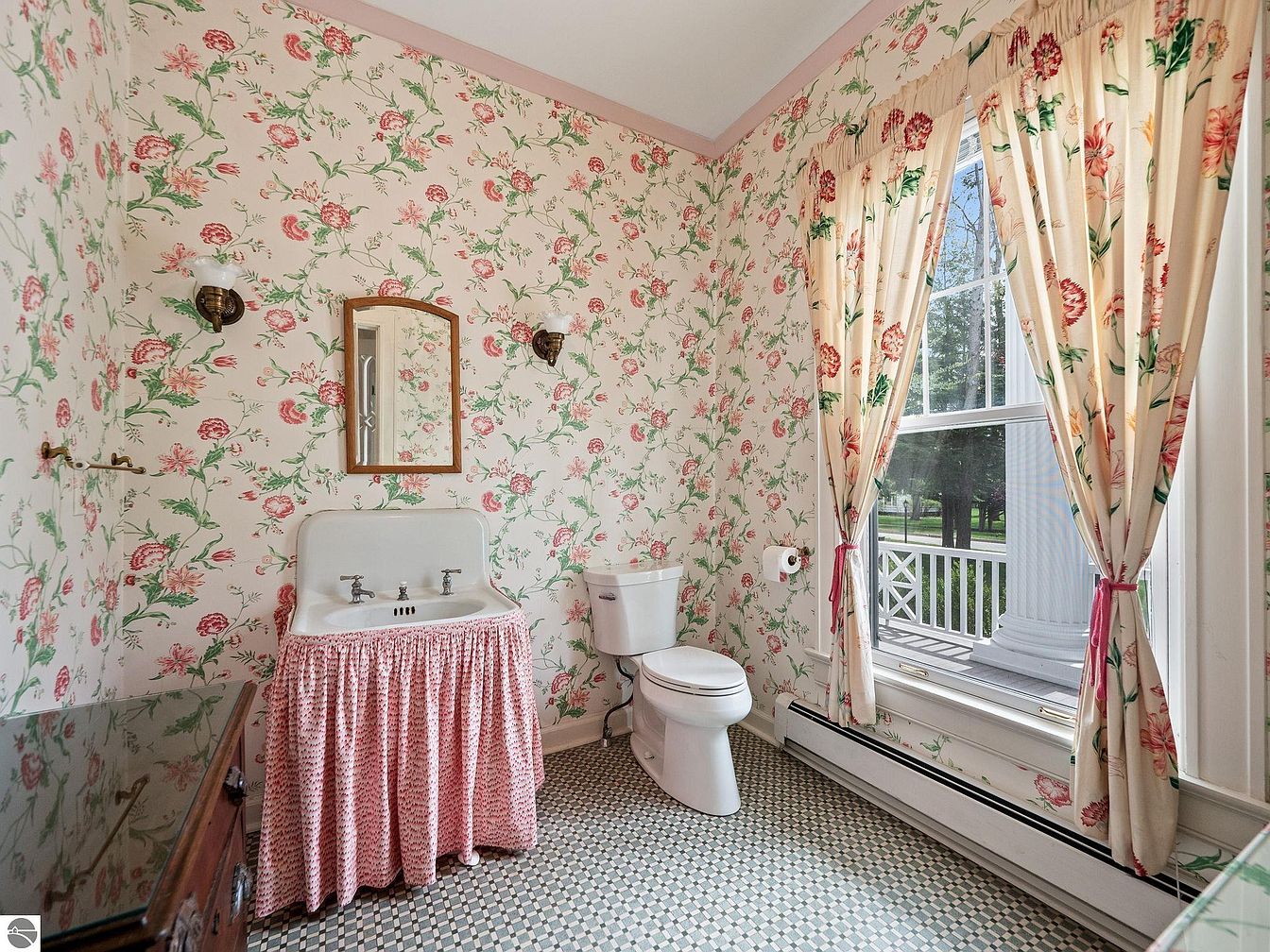 This vintage bathroom features a charming floral wallpaper with soft pink roses against a pale backdrop, enhancing its classic appeal. A white sink is adorned with a ruffled pink skirt, mirroring the hem of the window curtains, which also display the same floral pattern. Natural light pours in through a large window, framed by delicate curtains tied back with matching ribbons. To the side, a simple white toilet is complemented by a patterned black and white tiled floor, adding a touch of elegance. The room’s overall aesthetic exudes a nostalgic elegance synonymous with historic American homes.