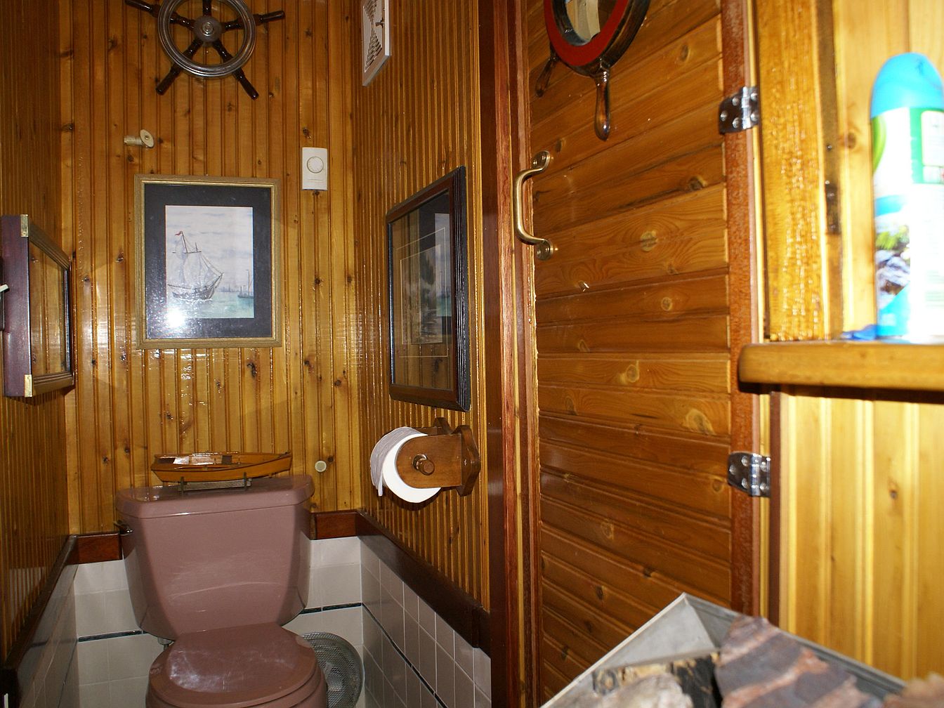 A compact bathroom with strong nautical theme, featuring honey-colored vertical wood paneling that covers the walls and door, giving the space a cozy cabin-like feel. A mauve-colored toilet sits beneath maritime artwork, including framed paintings of ships and a decorative ship’s wheel displayed above. The toilet paper holder and door handle are crafted from wood and brass, blending with the rustic aesthetic. A small mirror hangs on one wall, while a shelf holds air freshener and other toiletries. Elements like a model sailboat on the toilet tank and porthole-style accents evoke the feeling of being aboard a vintage ship.