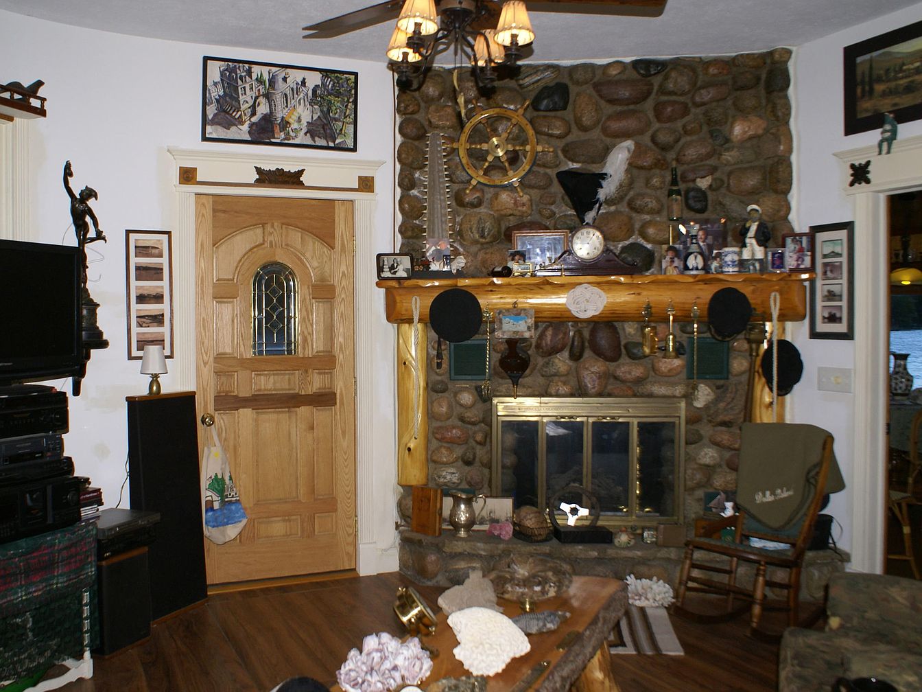 A cozy corner centers around a grand stone fireplace with a chunky log mantle decorated with family photos, a vintage clock, nautical items, and assorted collectibles. The large river rock stones add rustic texture, while brass-trimmed glass fireplace doors gleam beneath the shelf. To the left, a sturdy wood door with an ornate glass window is flanked by eclectic art and figurines, where a striped sock hangs from the knob. A rocking chair with a green throw sits invitingly on a warm-toned wooden floor. The ambiance is nostalgic, layered with personal mementos and historic Americana, accented by soft cream walls and natural timber.