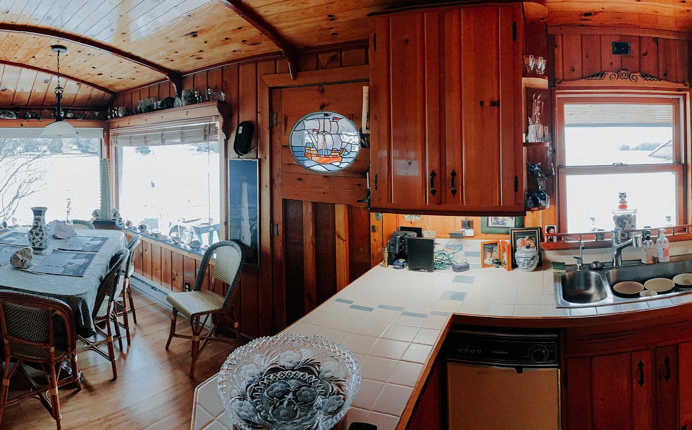 Warm wood paneling and cabinetry dominate the space, creating a cozy, rustic feel throughout. A U-shaped kitchen features white tile countertops accented with small blue squares, stainless steel sink, built-in dishwasher, and classic hardware. Above the sink, a window lets in abundant natural light, enhancing the golden wood tones. The adjacent nook has a rectangular wooden dining table covered in a light cloth, surrounded by wicker chairs, set next to large windows with views of snowy outdoors. Decorative china, crystal, and vases line the sills and shelves, while a door bears a striking stained glass ship motif, adding vintage charm.