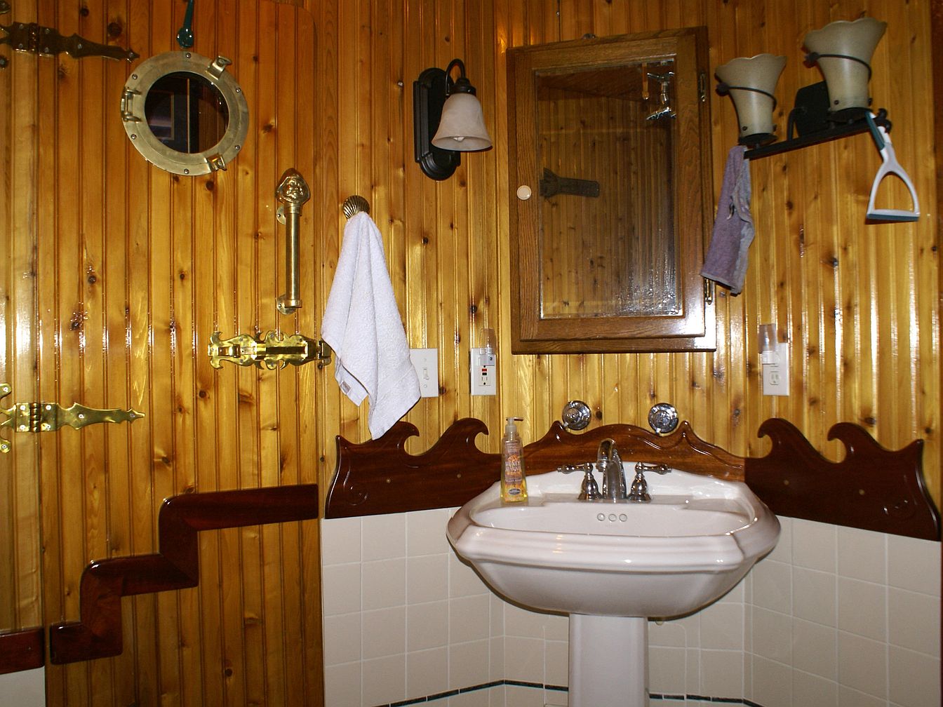 This bathroom features warm, honey-toned wooden paneling on the walls, evoking a nautical theme highlighted by a round brass porthole window and large, ornate brass hinges and fixtures. The white pedestal sink stands below a wooden-framed medicine cabinet mirror, flanked by uniquely shaped wall sconces with soft, beige shades. A white hand towel hangs from a brass holder beside the sink, while a decorative, dark wood trim with curved details runs behind the vanity. The lower half of the walls is lined with glossy white square tiles, and there is a staircase-like shelf to the left, continuing the maritime design aesthetic.