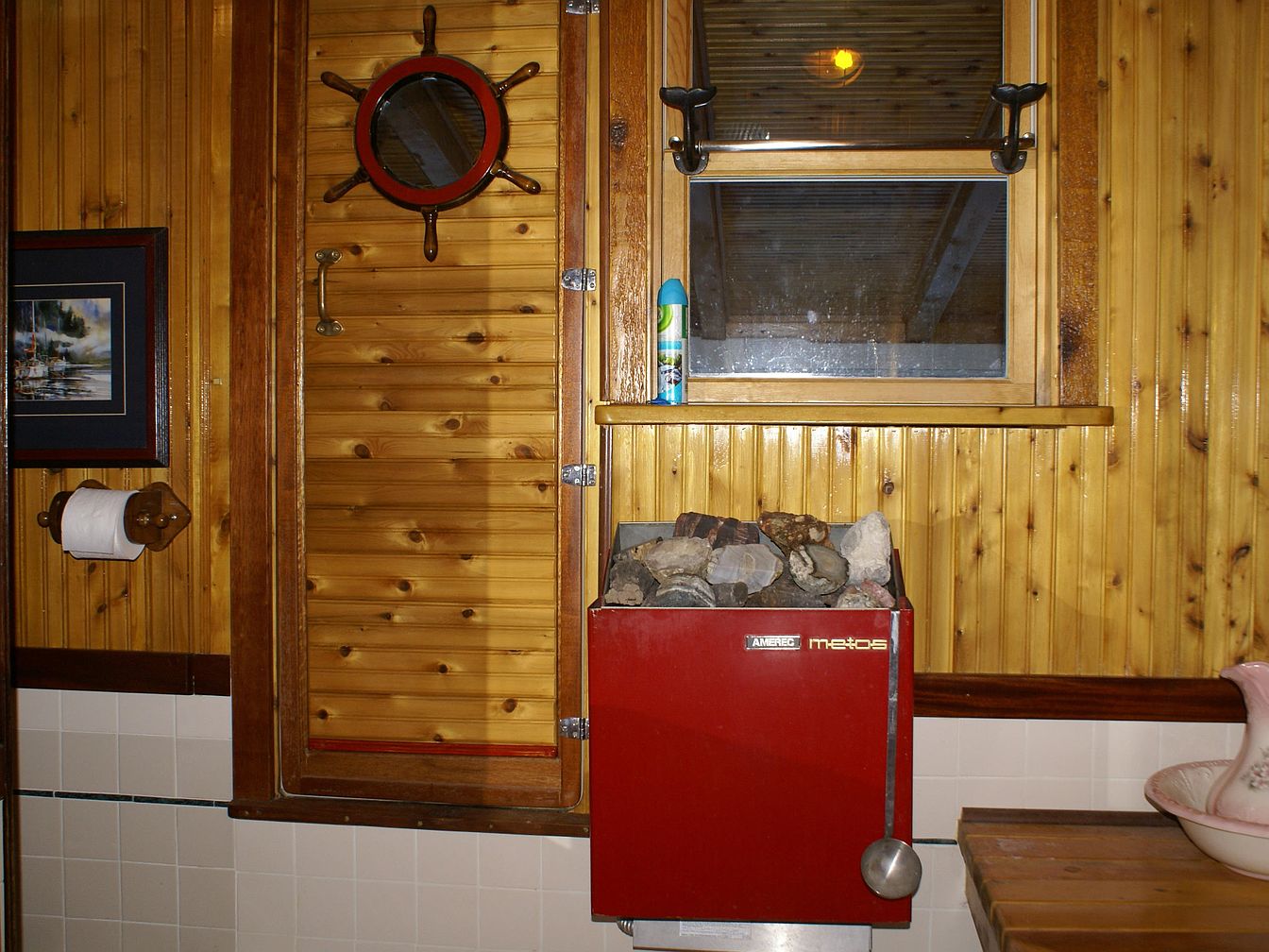 Warm, honey-colored wood panels line the walls, evoking a cozy, rustic ambiance reminiscent of a historic cabin. A small window with black latches lets in light above a red heater filled with rough stones, suggesting a traditional sauna experience. To the left, a round porthole window framed by a wooden wheel adds a nautical touch to the space. A vintage-style brass handle and a framed painting enhance the nostalgic feel. The lower walls have white tiles, and a pink floral wash basin sits atop a wood counter, balancing utilitarian elements with charming decorative details.