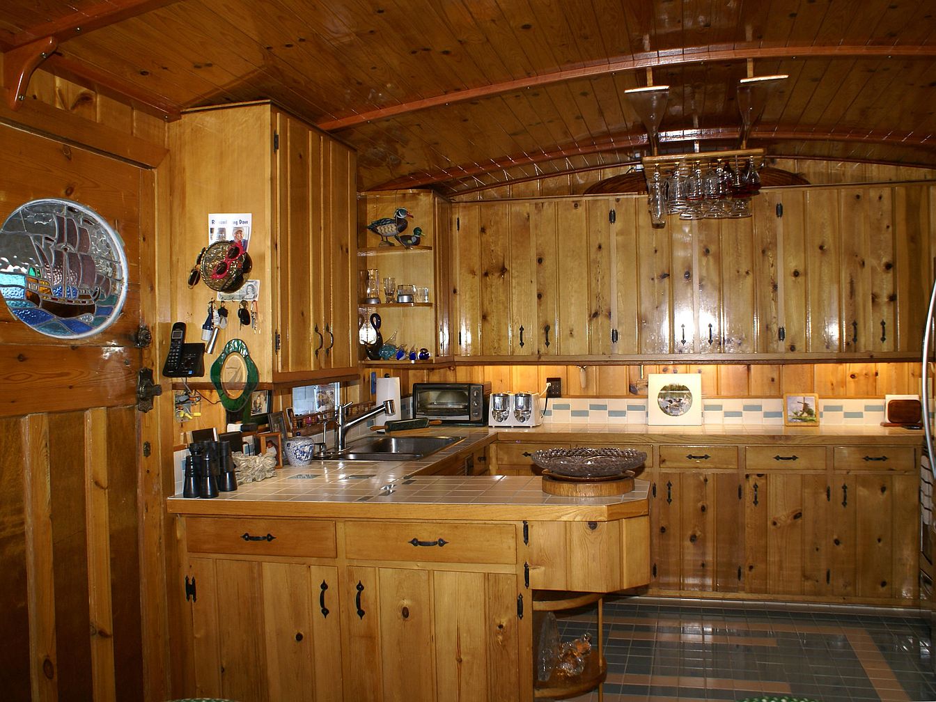 Warm honey-toned wooden cabinetry fills the walls and ceiling, creating a cozy rustic ambiance. The upper and lower cabinets are accented with dark wrought-iron handles, while the countertops feature light neutral tiles. A corner sink is set beneath under-cabinet lighting, and a small shelf displays various trinkets. The backsplash has a checkered blue and white tile pattern. Glassware hangs from an overhead rack, and kitchen essentials like a toaster, paper towels, and a microwave are neatly arranged. A stained glass porthole window with a ship motif adds character, complementing the historic, hand-crafted feel of the space.