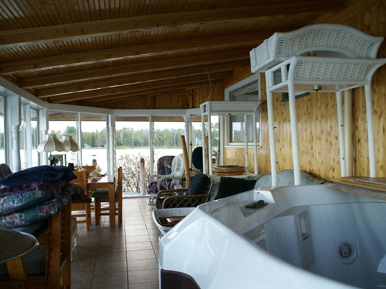 A spacious sunroom lined with large floor-to-ceiling windows overlooks a serene lake and tree line. The room features warm, honey-colored wood-paneled walls and a matching wood-beam ceiling, adding rustic charm. The tiled floor leads to a seating area filled with wicker and wood furniture, including a dining table, lounge chairs, and tables stacked upside down. There are plush cushions and throws casually piled on the chairs, suggesting a cozy, informal atmosphere. A large, white whirlpool tub sits in the foreground, giving a luxurious touch to the relaxed space. Soft natural light brightens the entire room.