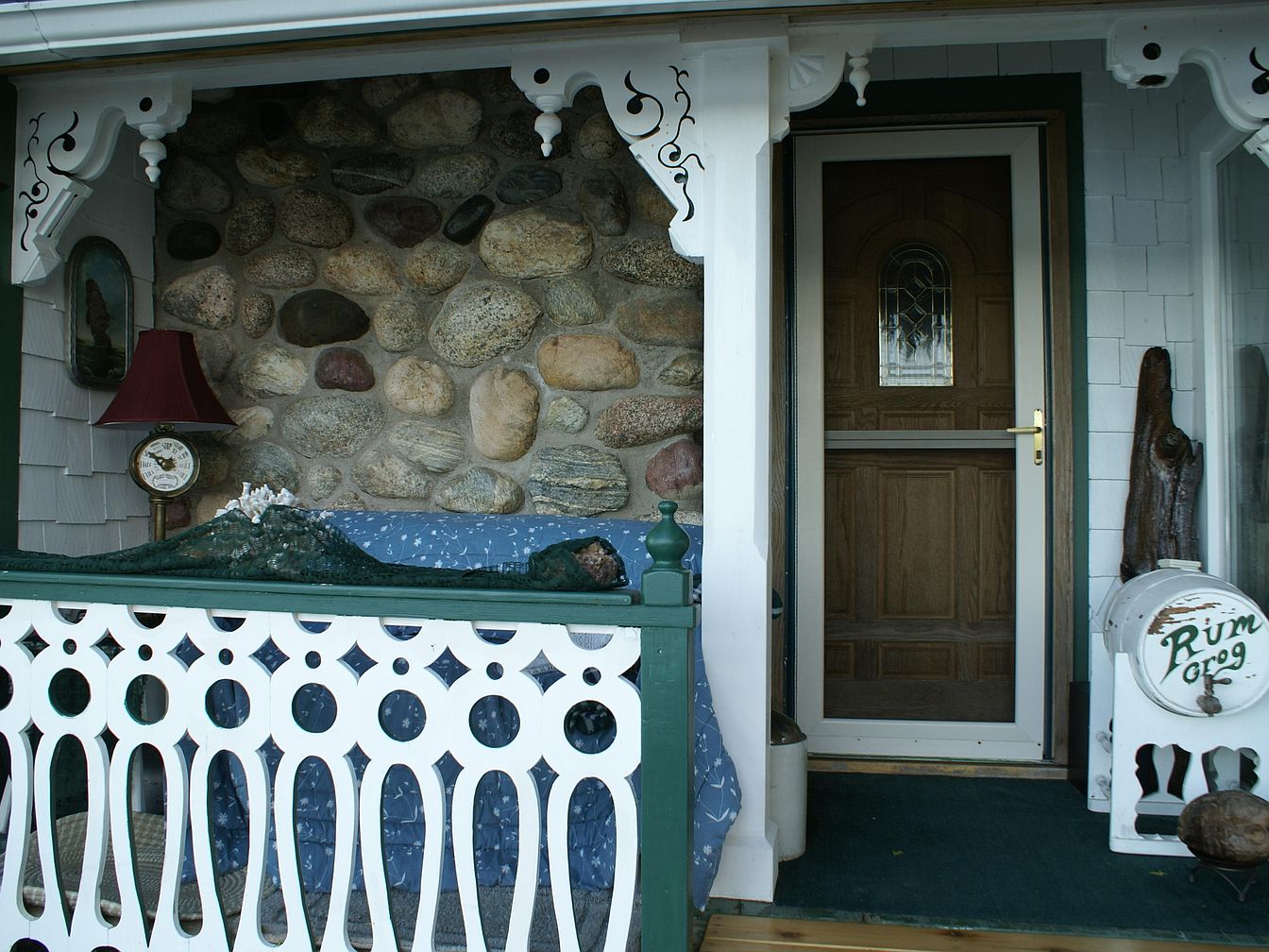 A small porch area features a rustic stone wall on one side and a solid wooden front door framed in dark green trim. Ornamental white trim with cut-out patterns decorates the porch posts and balustrade, contributing to a Victorian or cottage-like charm. There is a blue settee with a white star pattern cover and a net-like fabric draped over, offering a cozy sitting space. A vintage clock and a red lampshade sit on a small side table, while a quirky white barrel labeled ‘Rum Grog’ adds character. The space is accented with green and white painted wood, creating a welcoming lived-in atmosphere.