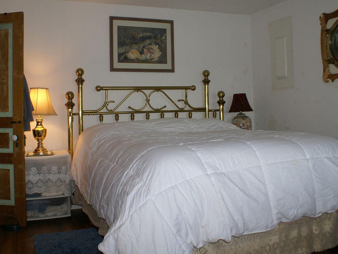 A cozy bedroom features a brass bed frame with polished posts and a plush white comforter. The walls are soft white, and a simple framed painting hangs above the bed. To the left, a vintage wooden door is slightly ajar, revealing a gold table lamp set atop a nightstand draped with lace. The lamp emits a warm, soft glow, creating an inviting atmosphere. Another lamp, with a decorative ceramic base and a dark shade, rests on the right side. A wall-mounted porthole mirror and a small, blue rug on hardwood floors add subtle character and historic charm to the space.