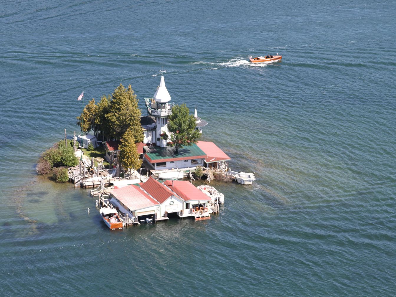 A small, wooded island is surrounded by blue water, featuring a cluster of buildings with green and red roofs nestled among tall evergreen trees. At the center stands a prominent, tower-like structure with a white conical roof, reminiscent of a lighthouse or Victorian turret, adding historic charm. Multiple docks and boat houses with direct access to the lake are visible, while pathways and patios weave around the structures. The natural shoreline is dotted with bushes and docks, creating a rustic, secluded retreat. Off the island, a small orange boat glides through the water, suggesting easy water access and a tranquil lakeside lifestyle.